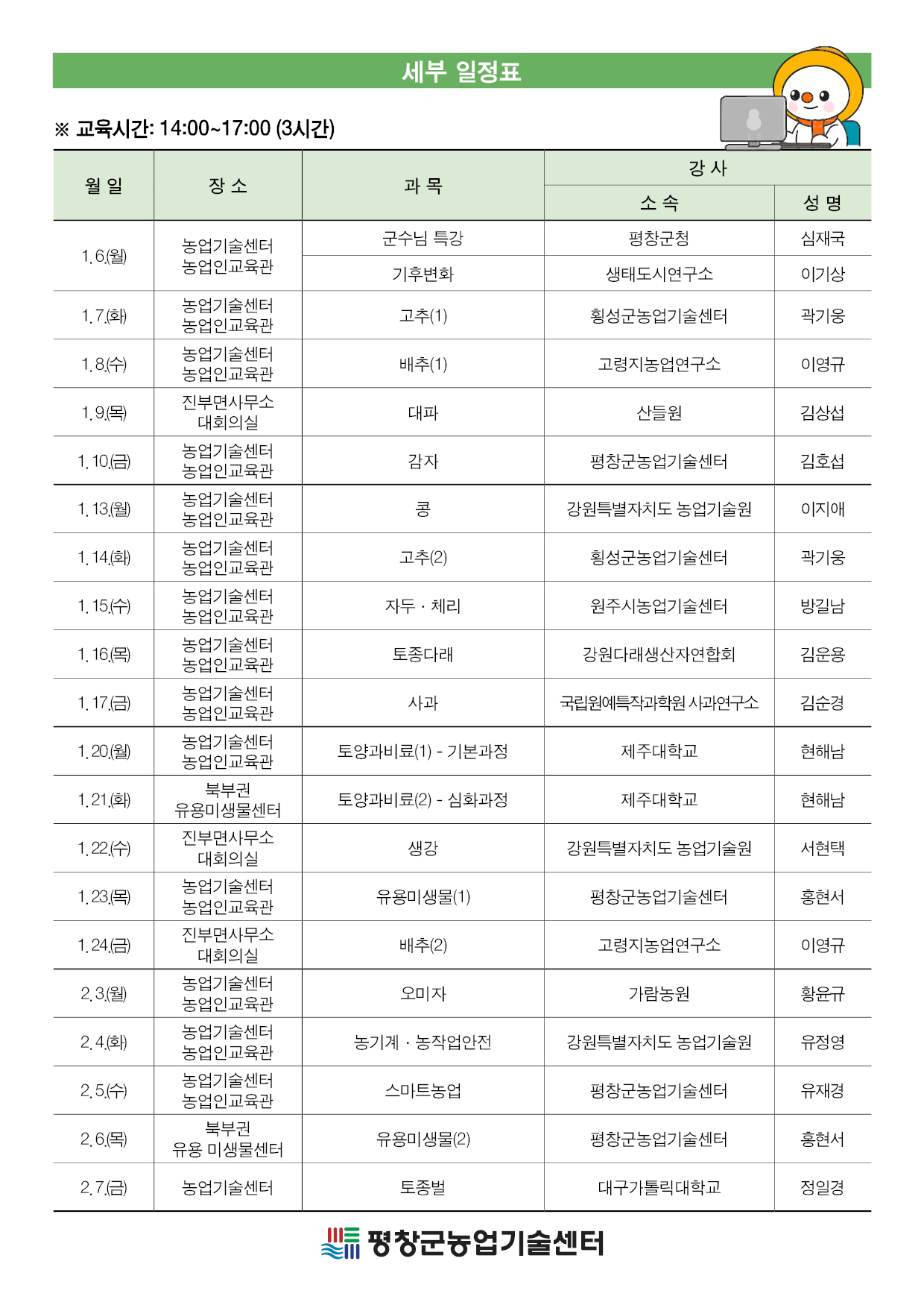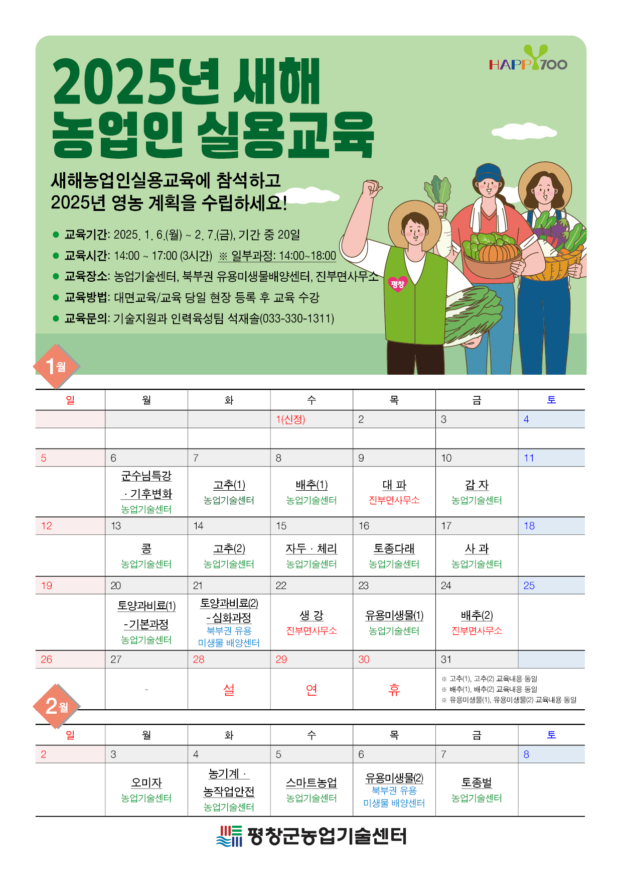 2025년 새해농업인실용교육 일정을 아래와 같이 알려드리오니, 해당 내용을 참고하시어 교육에 많은 참석 부탁드립니다.