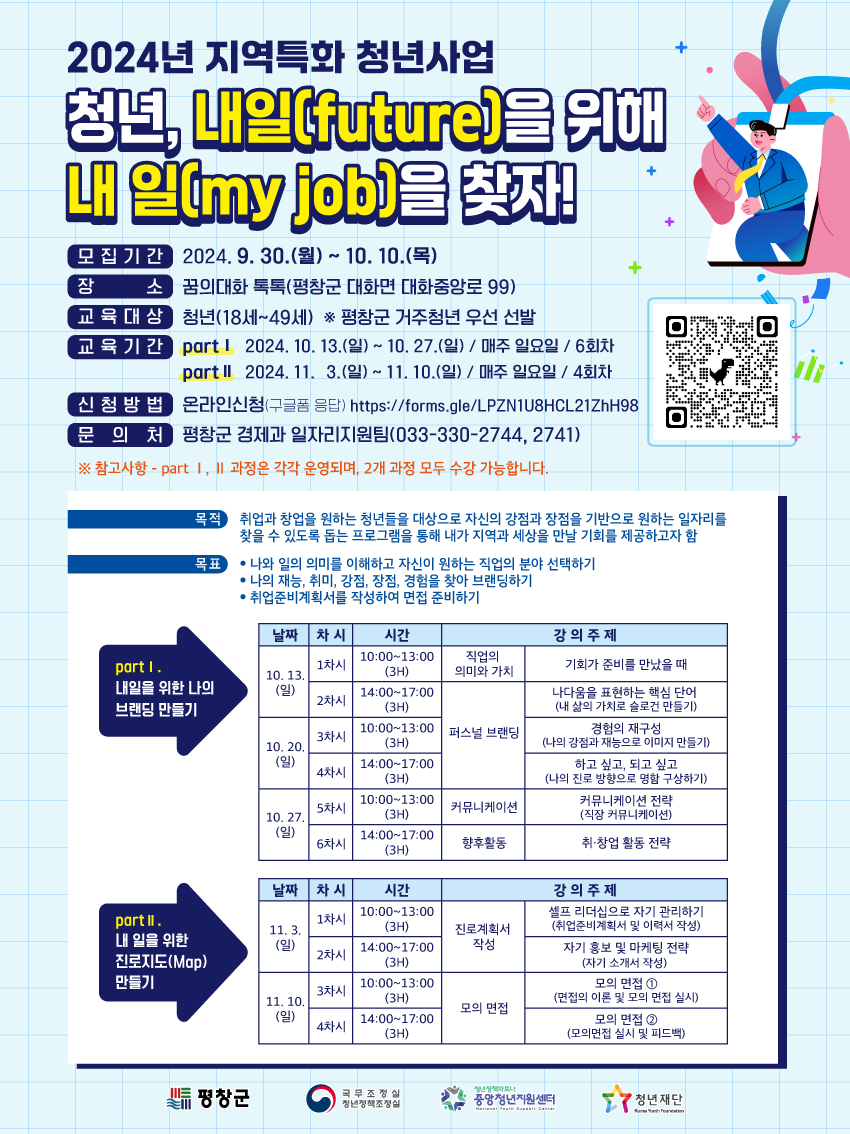 평창군에서는 '2024년 지역특화 청년사업'의 일환으로 '청년, 내일(future)을 위해 내 일(my job)을 찾자!' 과정을 운영합니다.