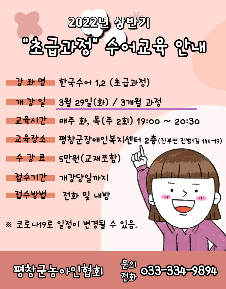 4. 교육장소: 평창군장애인복지센터 2층 농아인협회(진부면 진벌1길 144-19)5. 교육문의: 033-334-9894