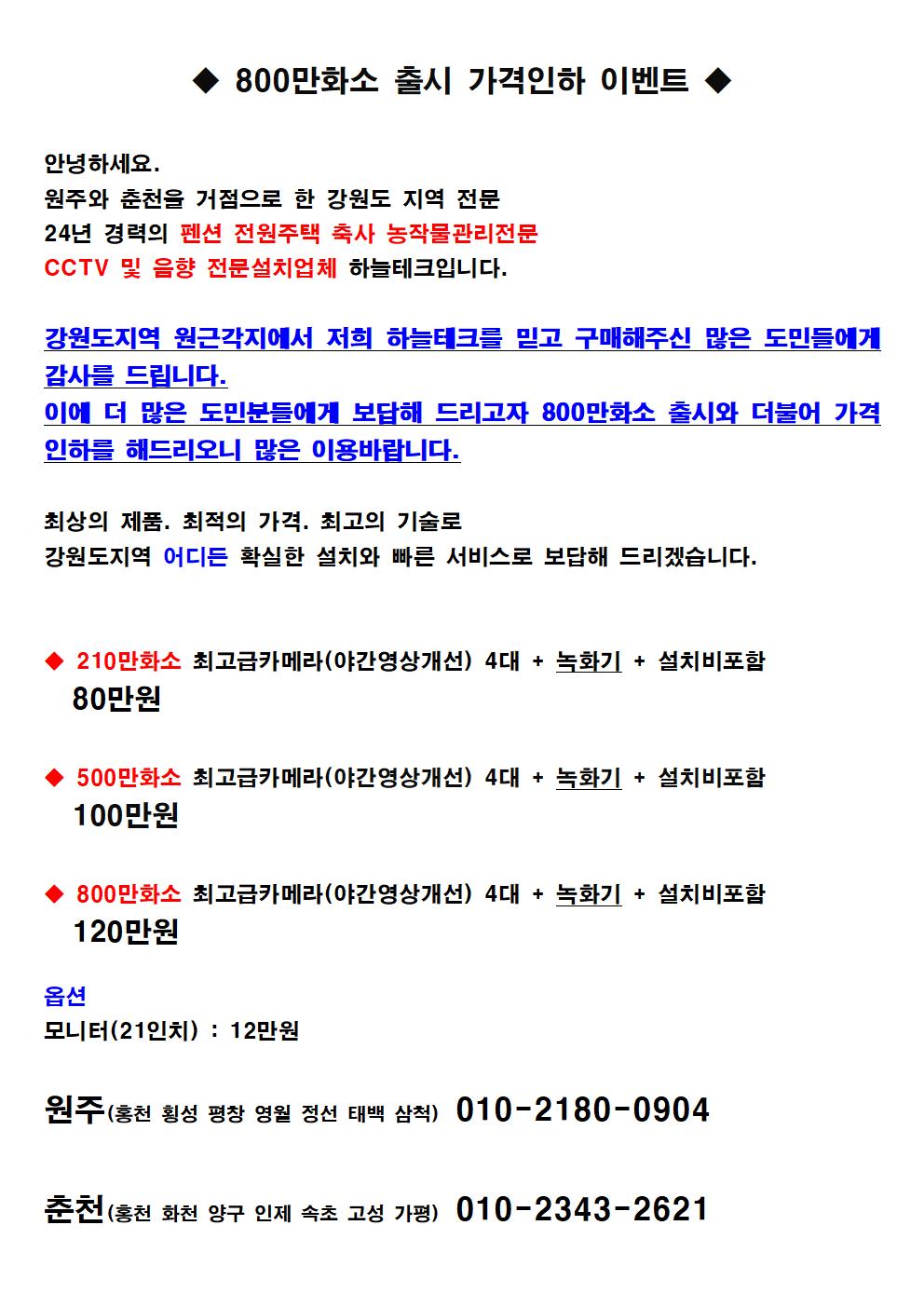 이에 더 많은 도민분들에게 보답해 드리고자 800만화소 출시와 더불어 가격인하를 해드리오니 많은 이용바랍니다.