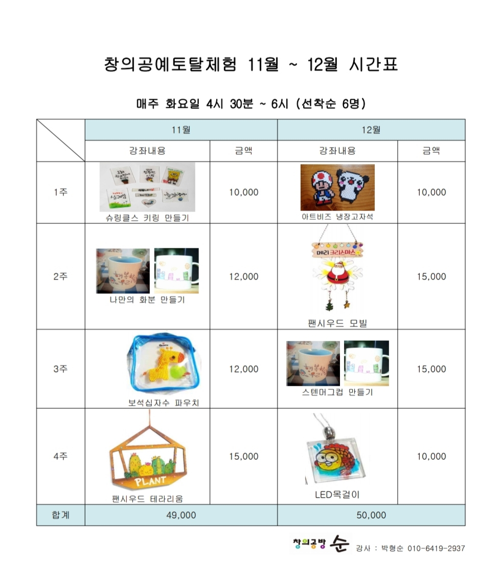 1월부터는 월수강료 4만원, 재료비 별도로 진행됩니다.