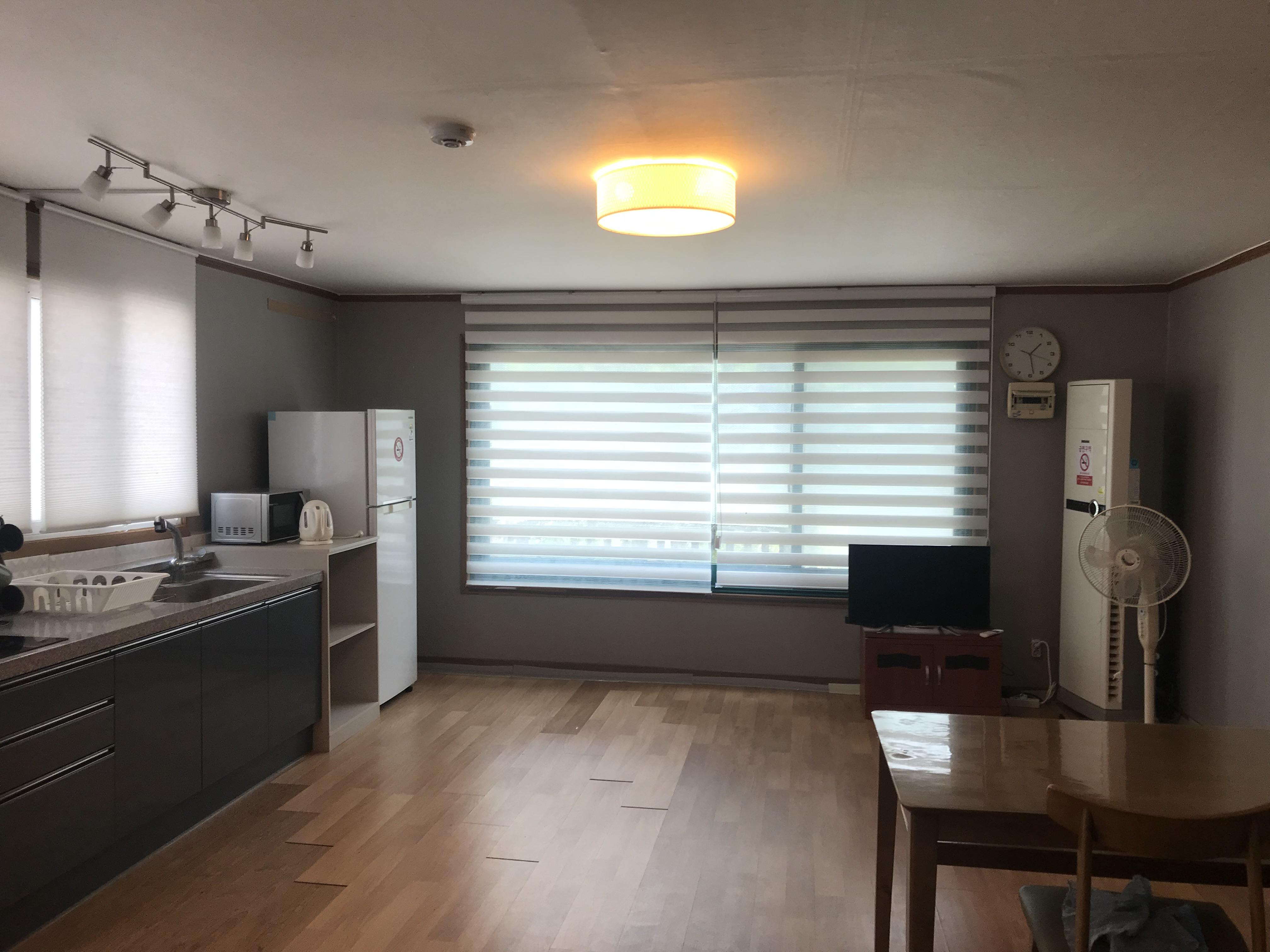 TV,무선와이파이 무선인터넷,에어컨 6인용식탁,더블짐대,냉장고,전자렌지 전기밭통.전기주전자,세탁기 4인기준식기류가 구비되여 있습니다