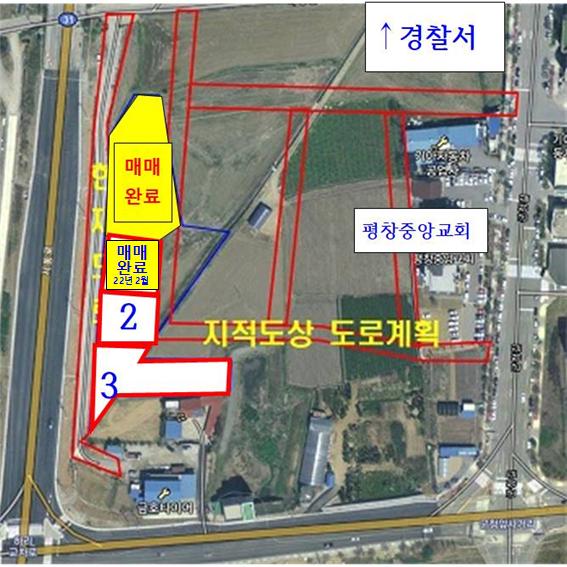 - 왼쪽, 현재 국도 밑 소도로 접합- 오른쪽 중앙교회 방면 지적도상 도시계획도로 지정됨