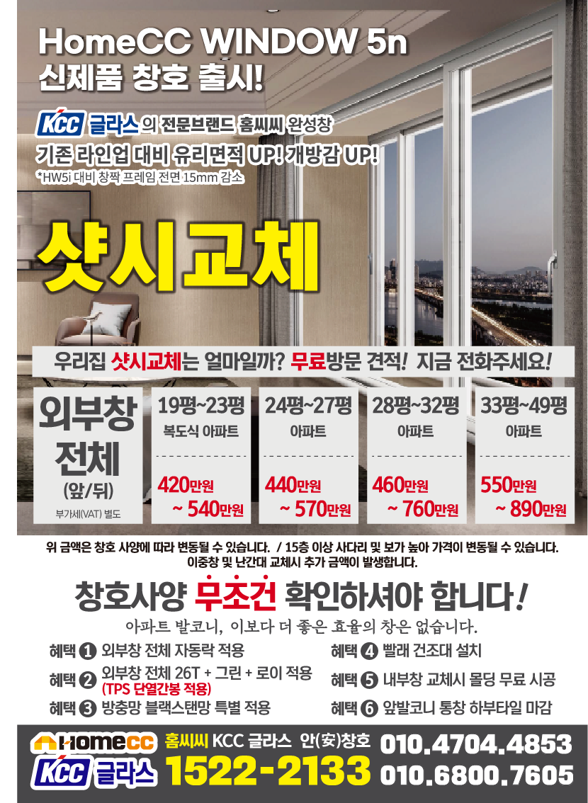 **기후 변화로 인한 자연재해가 심각한 요즘입니다. 폭우,폭염,폭설... 노후된 아파트에는 창호교체가 선택이 아닌 필수가 된 상황인데요. 창호교체를 고민하고 계시는 고객님들에게 좋은 조건으로 정직하고 합리적인 금액으로 행사진행하고 있습니다. KCC글라스 홈씨씨, KCC,LX;ZIN,DUCOBA 등 원하시는 브랜드로 시공가능 하십니다. 궁금하신 점 연락주시면 무료 방문상담,실측 가능하오니 전화주세요^^