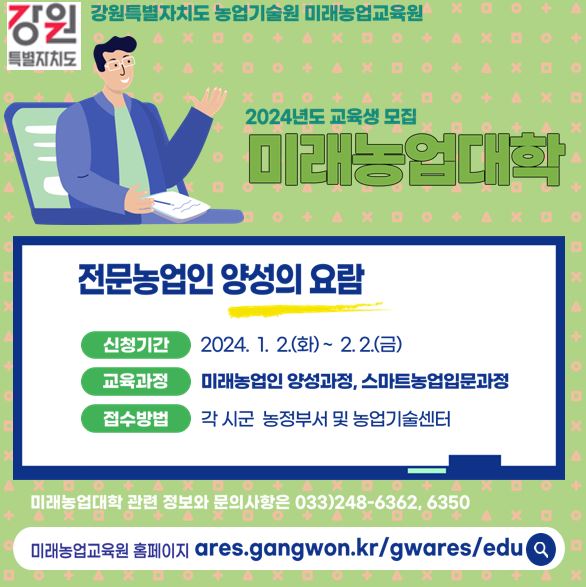 《 지원자격 》 (공통) 2024년 1월 1일 이전까지 본인의 주민등록상 주소지가 강원특별자치도로 되어 있는 사람 중장기 교육과정 참여가 가능하고 단체생활에 결격사유가 없는 사람 (미래농업인양성과정) 20세이상 50세 이하의 농업인 또는 영농희망자 (스마트농업입문과정) 스마트농업에 관심있는 도민 《 신청방법 》 ❶ 신청기간 : 2024. 1. 2.(화) ~ 2024. 2. 2.(금)까지 ❷ 신청방법 : 거주지 시군 농정부서(농업기술센터) 신청 - 문의 : ☎ 033)248-6362 또는 248-6350 《 제출서류 》 ▶ 입학원서, 개인정보 수집·이용 동의서(붙임파일 사용), 건강진단서(기본), 주민등록등본(고유식별번호 미포함) - 건강진단서, 주민등록등본은 2024. 1. 1. 이후 발행된 것이어야 함 - 건강진단서 : 거주지 보건소 발행분으로 B형간염, 매독, 흉부P-A(폐결핵) 항목 반드시 포함 ※ 건강진단서는 합숙생활의 적합성 여부를 판단하며 제출 서류의 누락 허위 사실 발견 시 불이익을 받을 수 있음 | ||