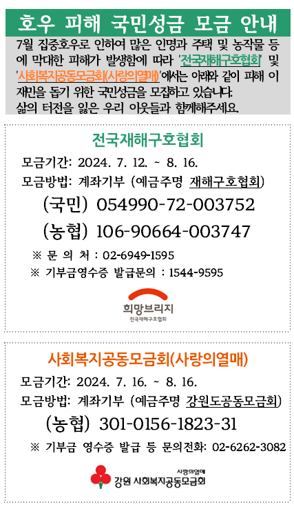 '전국재해구호협회' 및 '사회복지공동모금회(사랑의열매)'에서는 아래와 같이 피해 이재민을 돕기 위한 국민성금을 모집하고 있습니다.