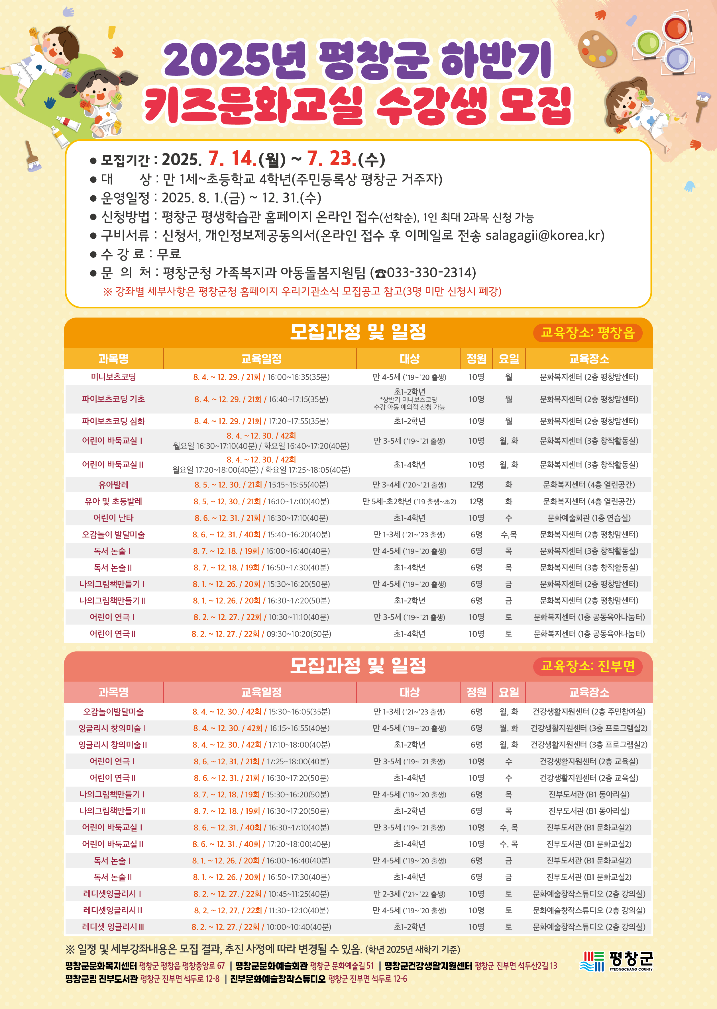 2025년 평창군 하반기 키즈문화교실 수강생 신청접수가 2025. 7. 14.(월)부터 7.23.(수)까지 진행됩니다.
