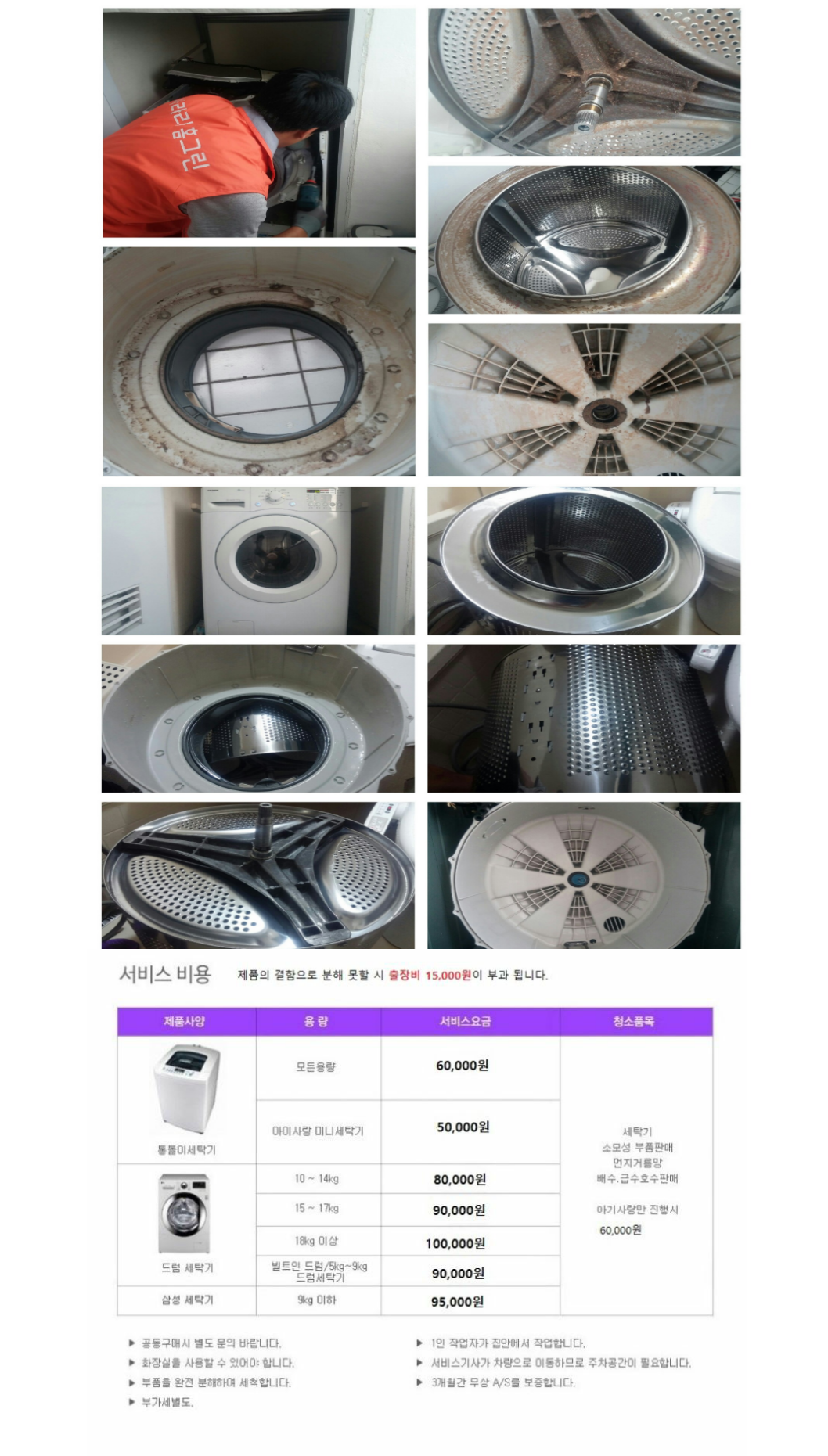안녕하세요.홈케어전문업체 아라리홈그린입니다.세탁기청소, 에어컨청소, 보일러배관청소, 매트리스청소 등 가전제품 청소를 전문으로 하고 있습니다.전화 주시면 친절하게 안내드리겠습니다.네이버에서 "아라리홈그린"을 검색하시면 가격 및 서비스를 안내 받으실 수 있습니다.3품목 이상 의뢰시 할인대표번호 1811-1693기사번호 010-8783-5246https://blog.naver.com/michol11