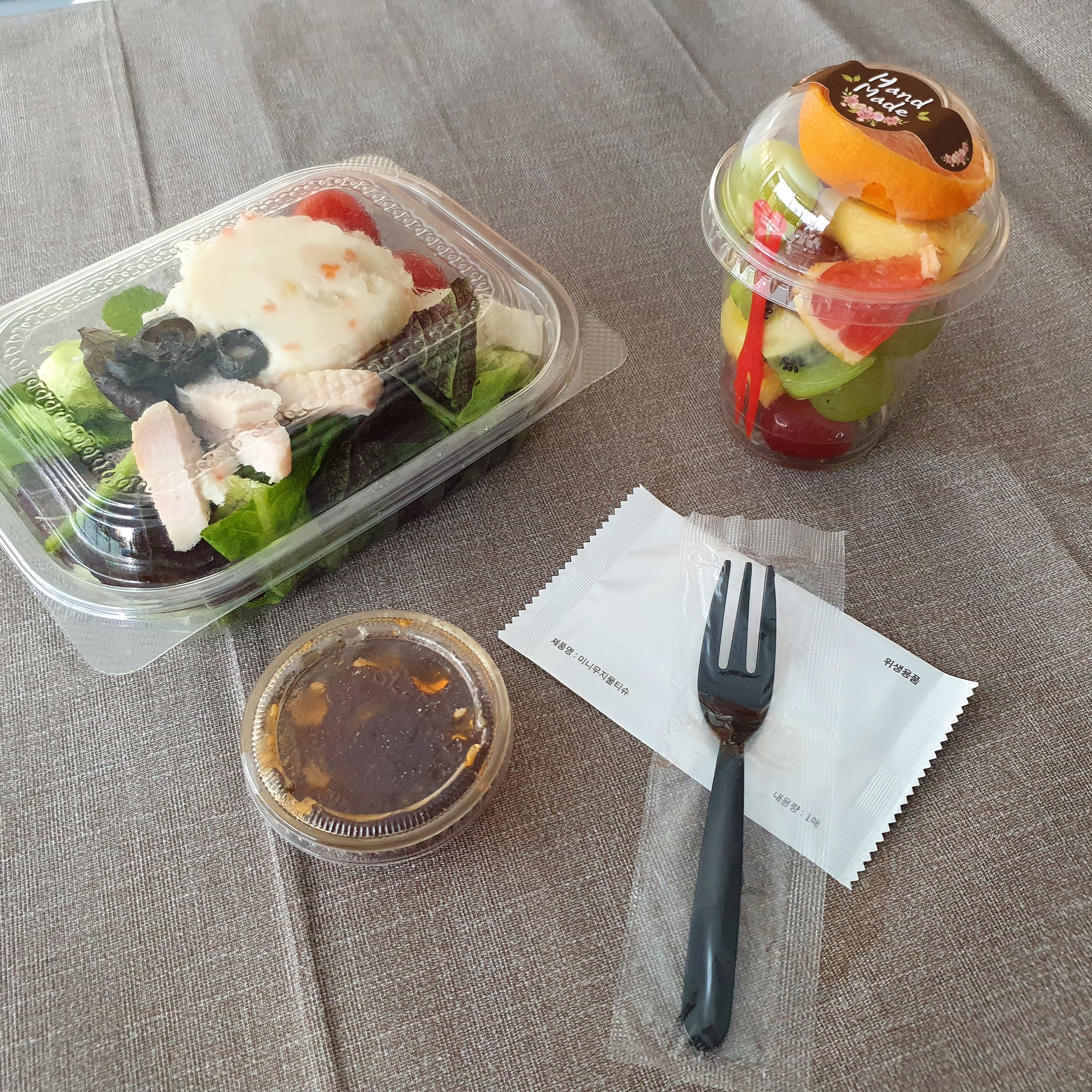 반찬 뿐만 아니라 샐러드와 컵과일도 함께 합니다.