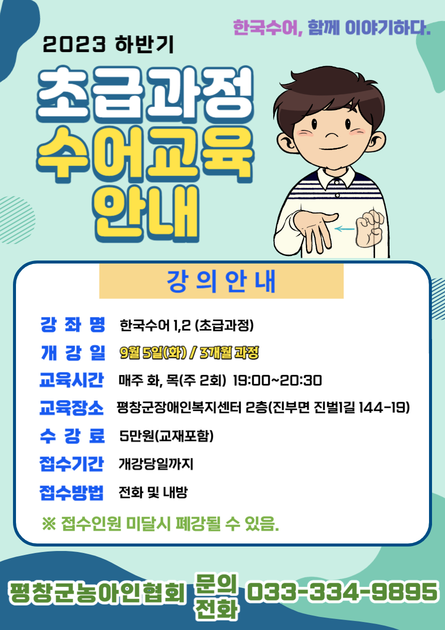 [평창군농아인협회] 2023 하반기 "초급과정" 수어교육 안내