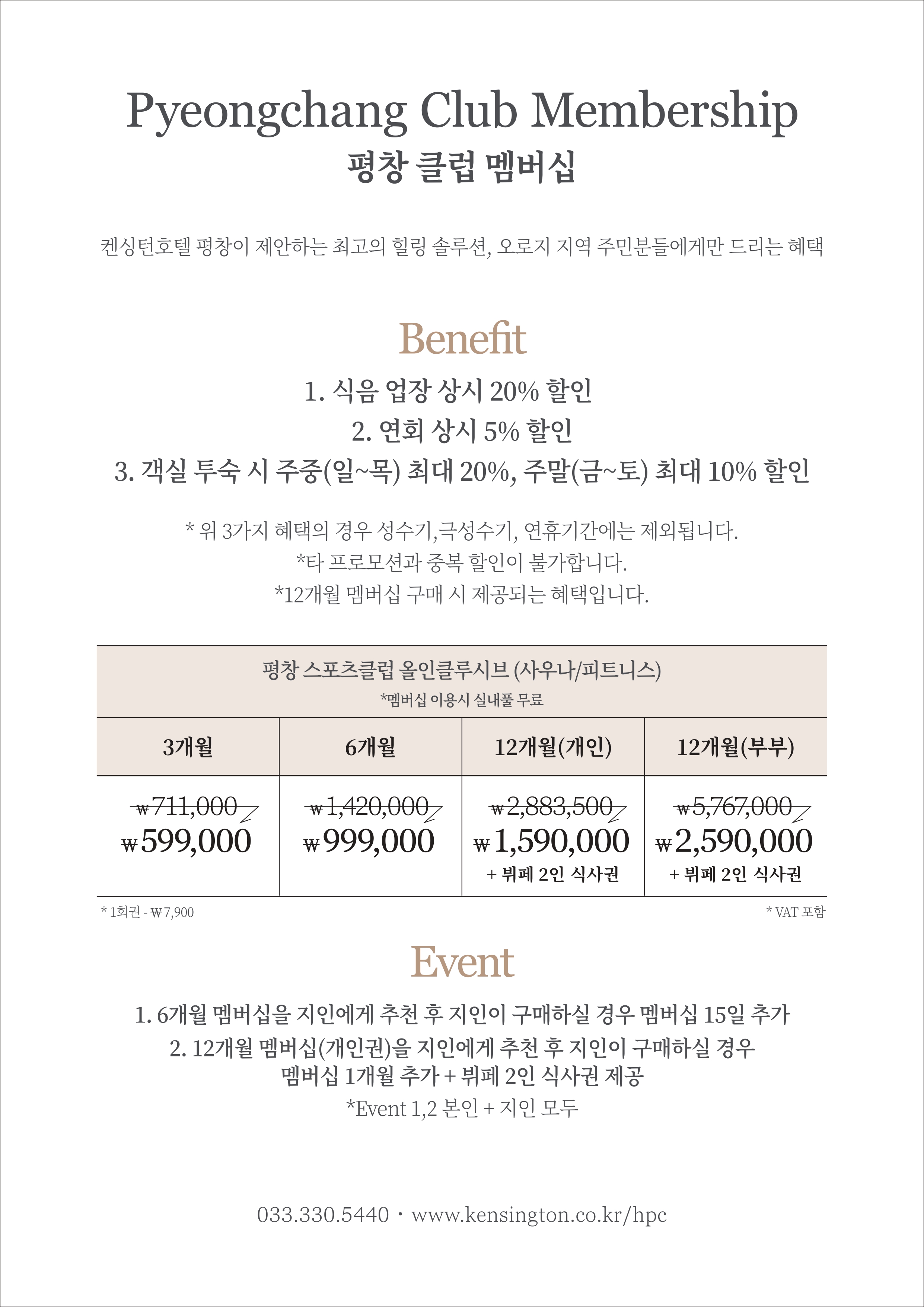 켄싱턴호텔 평창 스포츠클럽 올인클루시브 멤버십 (사우나/피트니스)