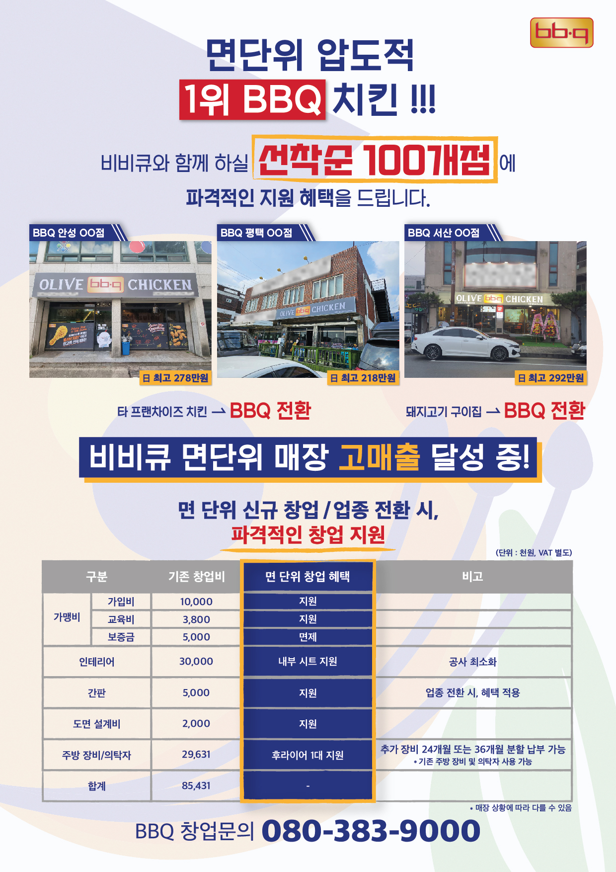 BBQ치킨에서 가맹점 패밀리사장님 모집합니다.(면단위 100% 지원, 투자비 0원)