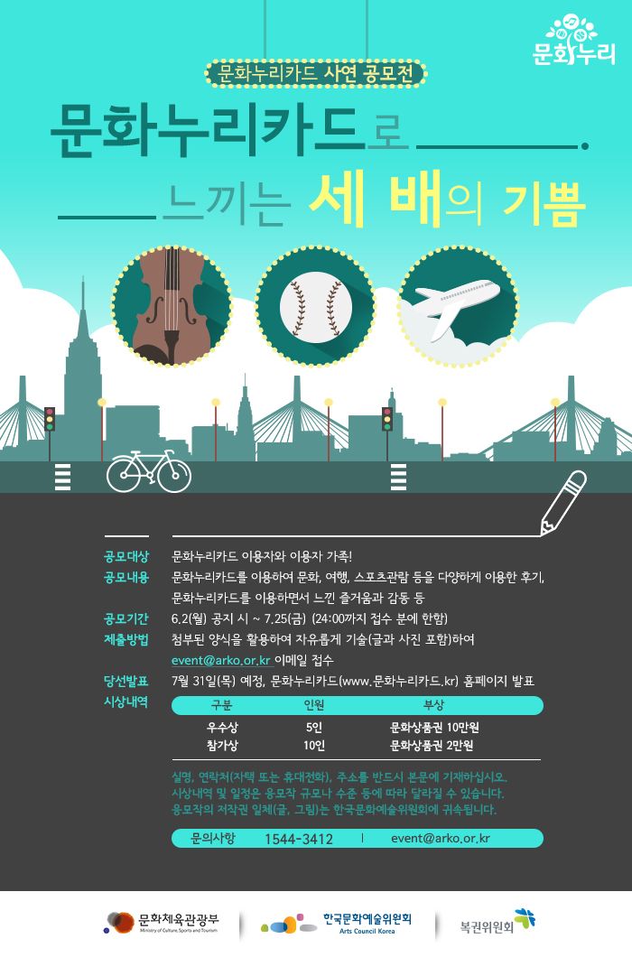 문화누리카드 사연 공모전을 붙임과 같이 개최하오니, 문화누리카드 이용자의 많은 참여 바랍니다^^