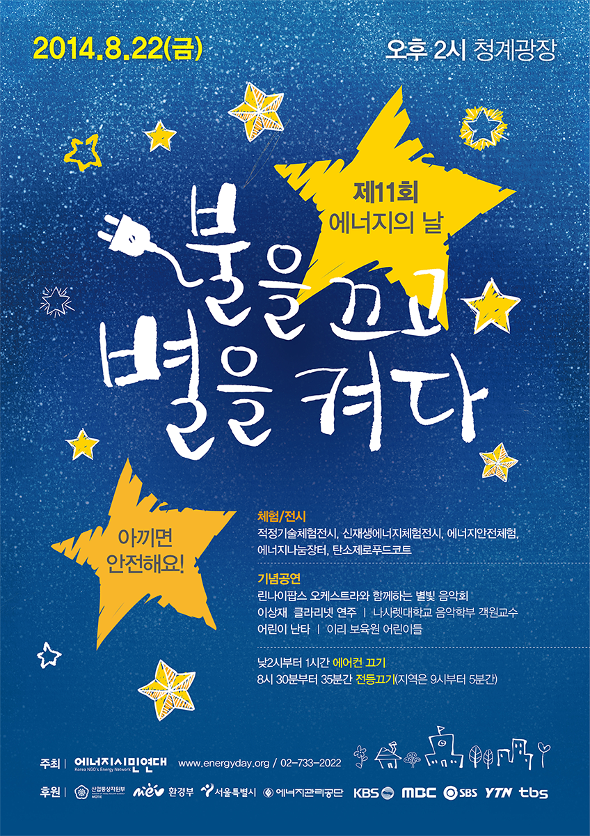 여름철 전력피크 억제 및 범국민적 에너지절약에 대한 사회적 인식 확산을 위해 에너지시민연대가 개최하는 제11회 에너지의 날행사가 오는 8.22.(금) 전국적으로 실시됩니다. 동 행사가 여름철 전력피크 억제 등 소기의 목적을 달성할 수 있도록 각 기관, 단체, 가정에서도 적극 참여하여 주시기 바랍니다. ○ 에너지의 날 실천행사 - 에어컨 설정온도 2도 올리기 (14:00~15:00) - 전국 35분간 소등행사 (20:30~21:05)(지역은 21:00~21:05 5분간) *에너지의날 홈페이지 : www.energyday.org *2003년 8월 22일 사상 최대의 전력 소비량을 기록한 날을 기점으로 에너지 절약에 대한 국민적 공감대를 형성하기 위해 지난 2004년부터 8월 22을 에너지의 날로 지정 |