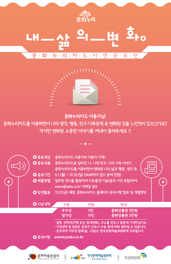 □ 공모내용 : 문화누리카드로 달라진 나, 친구, 가족이야기, 문화누리카드를 이용하면서 변화된 나의 삶과 행동, 생각 등
