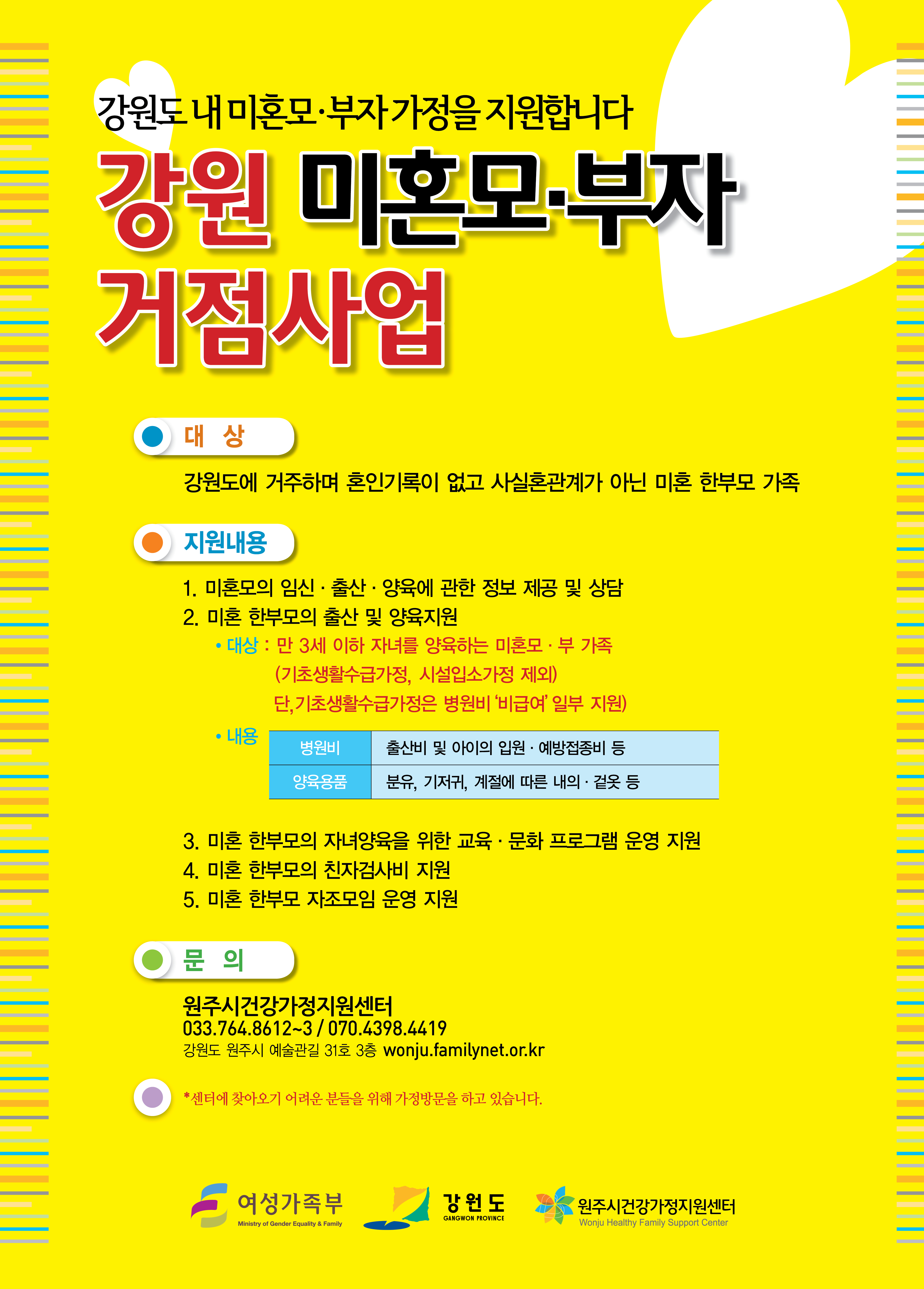 강원도에서는 미혼모ㆍ부자 가정의 아동양육 및 자립을 지원하기 위하여 강원도 미혼모ㆍ부자 지원기관(원주시건강가정지원센터)을 다음과 같이 운영하고 있습니다.