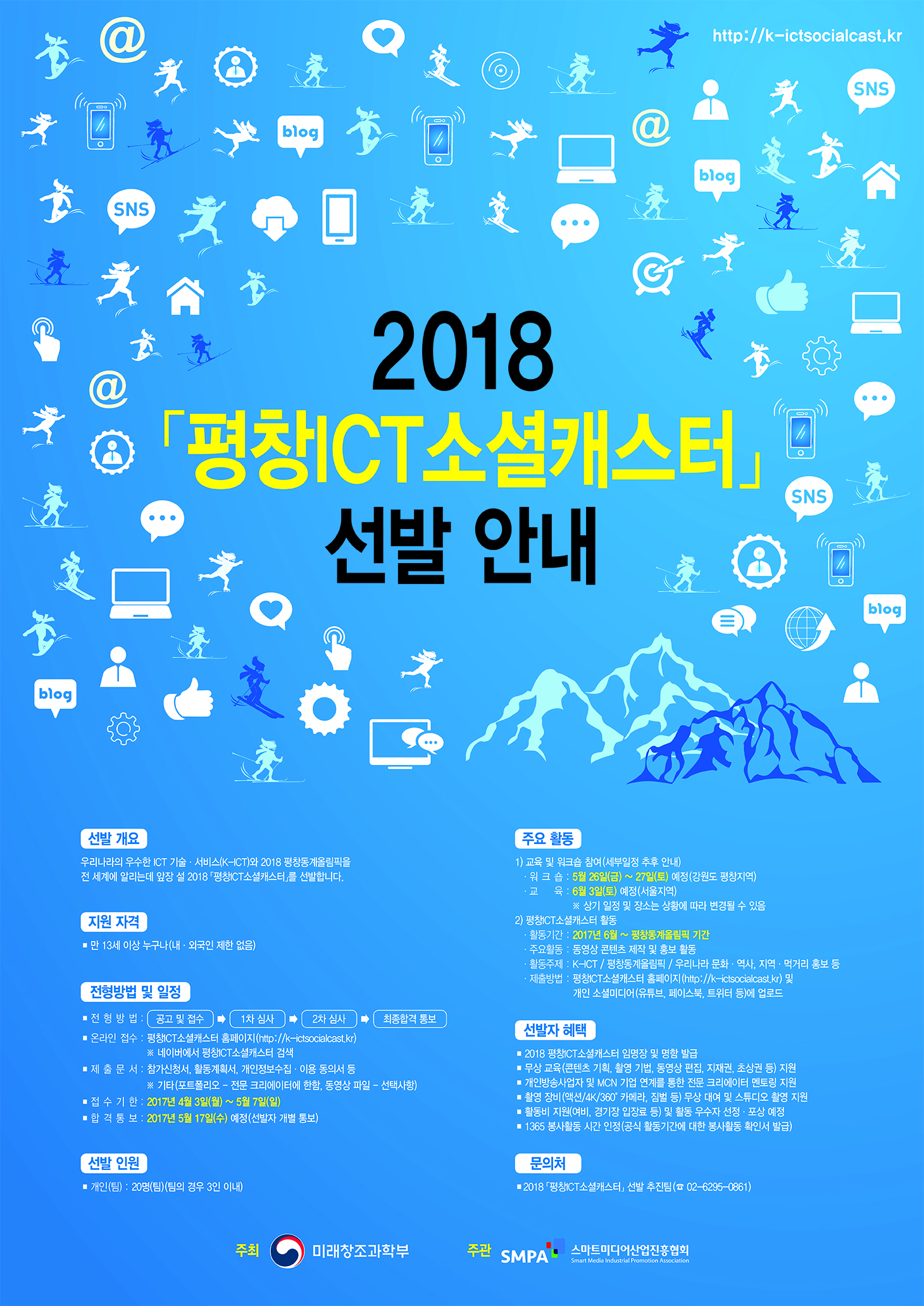 ※ 공고 관련 문의 : 평창 ICT소셜캐스터 선발 추진팀(02-6295-0861)