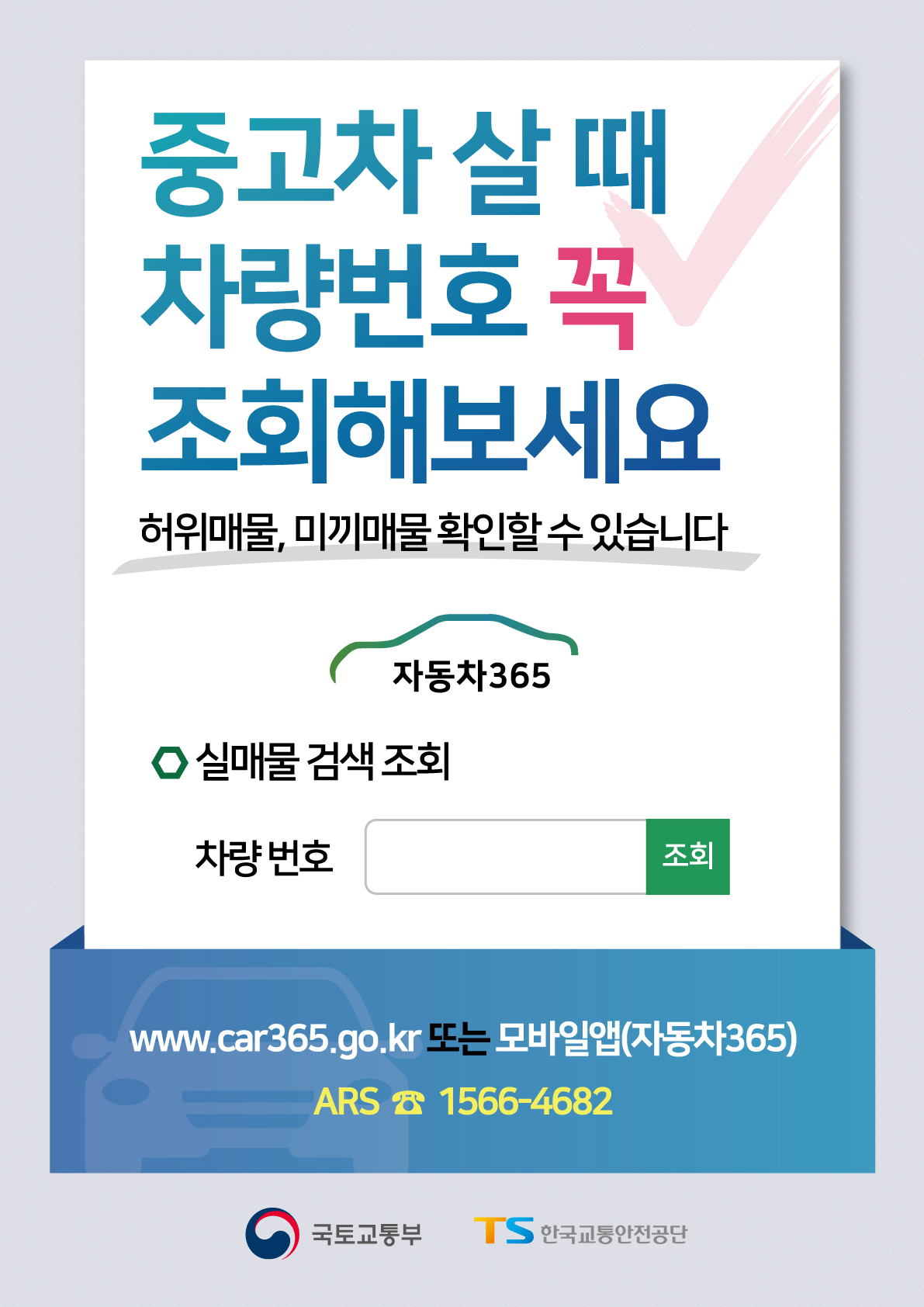국토교통부는 중고차 허위매물 광고에 소비자 피해를 방지하기 위하여 자동차 365 사이트(www.car365.go.kr)를 통해 중고차 실 매물 검색서비스를 제공(`19.10월부터)하고 있습니다.