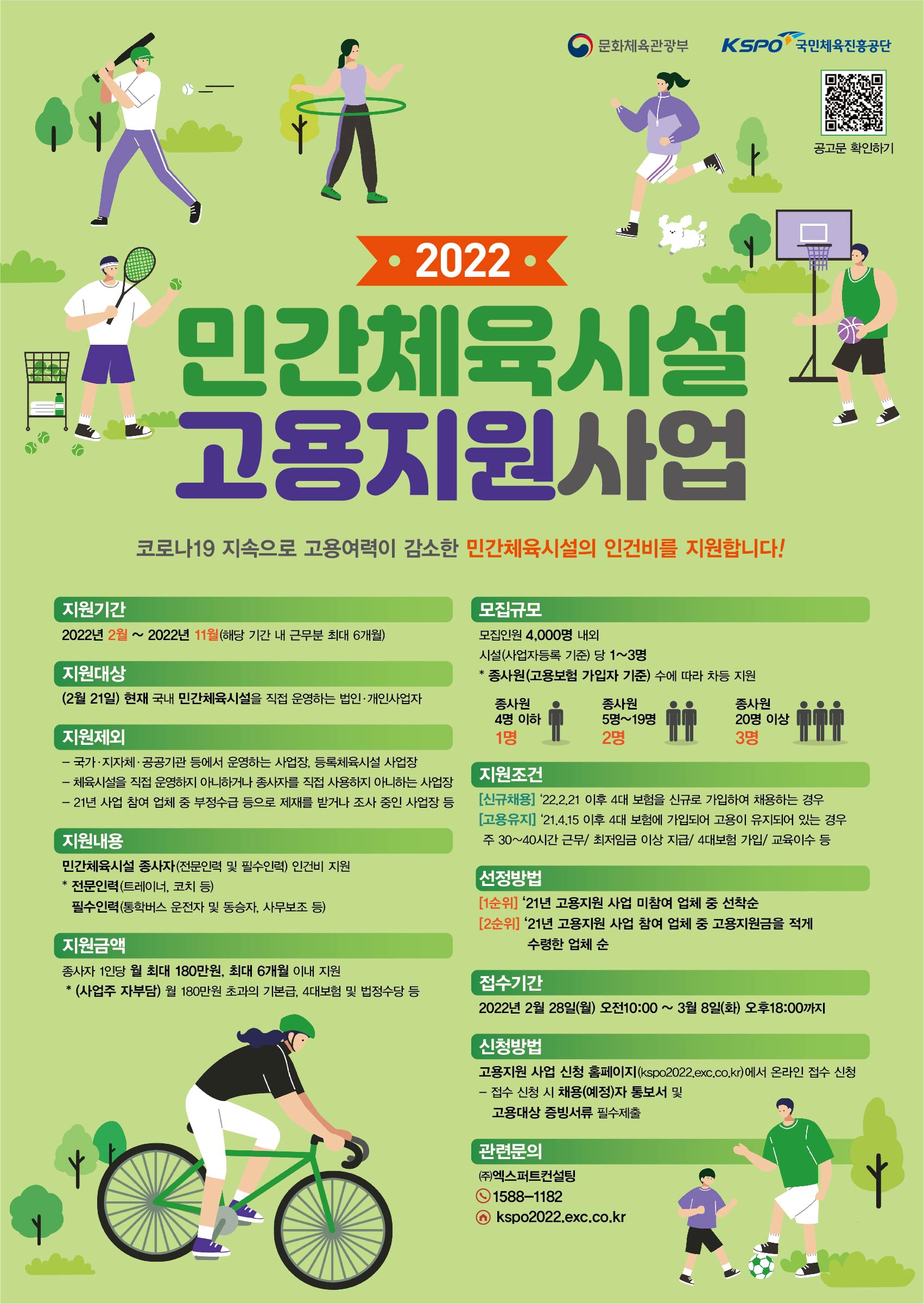 문화체육관광부와 국민체육진흥공단은 코로나19 지속으로 고용여력이 감소한 민간체육시설업체의 경영위기를 극복하고 안정적인 일자리 창출을 위해 지원 대상을 확대한 사업을 아래와 같이 「민간체육시설 고용지원 사업」을 시행하오니 민간체육시설업체의 적극적인 관심과 많은 참여 바랍니다.