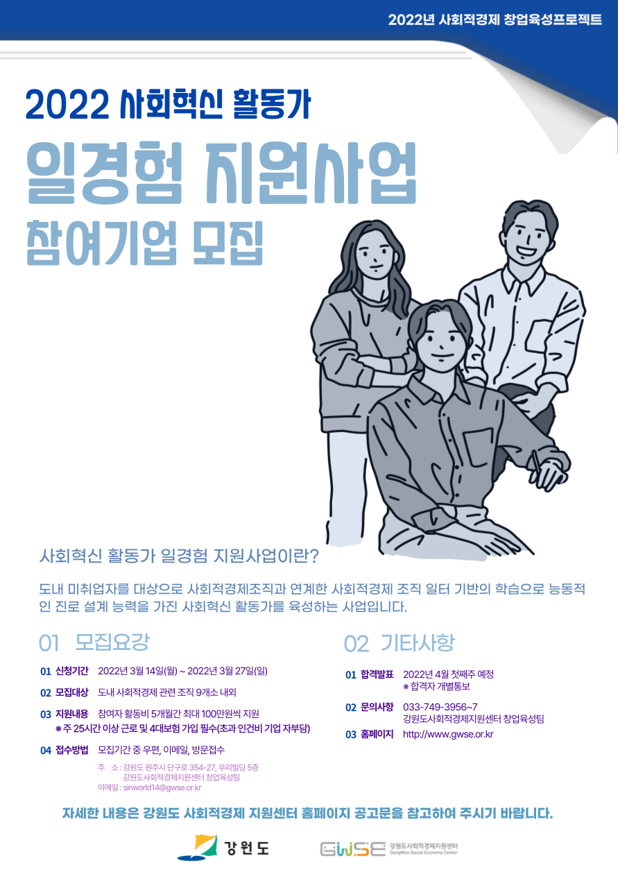 2022년「사회혁신 활동가 일 경험 지원(강원 JOBs」참여기업을 모집합니다.