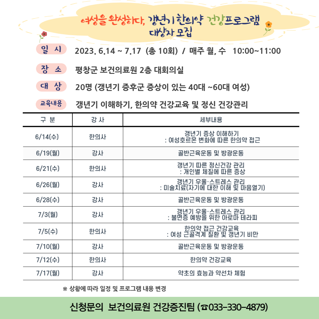☏ 신청 및 문의: 보건의료원 건강증진팀 033-330-4879 ※ 선착순 20명 마감!