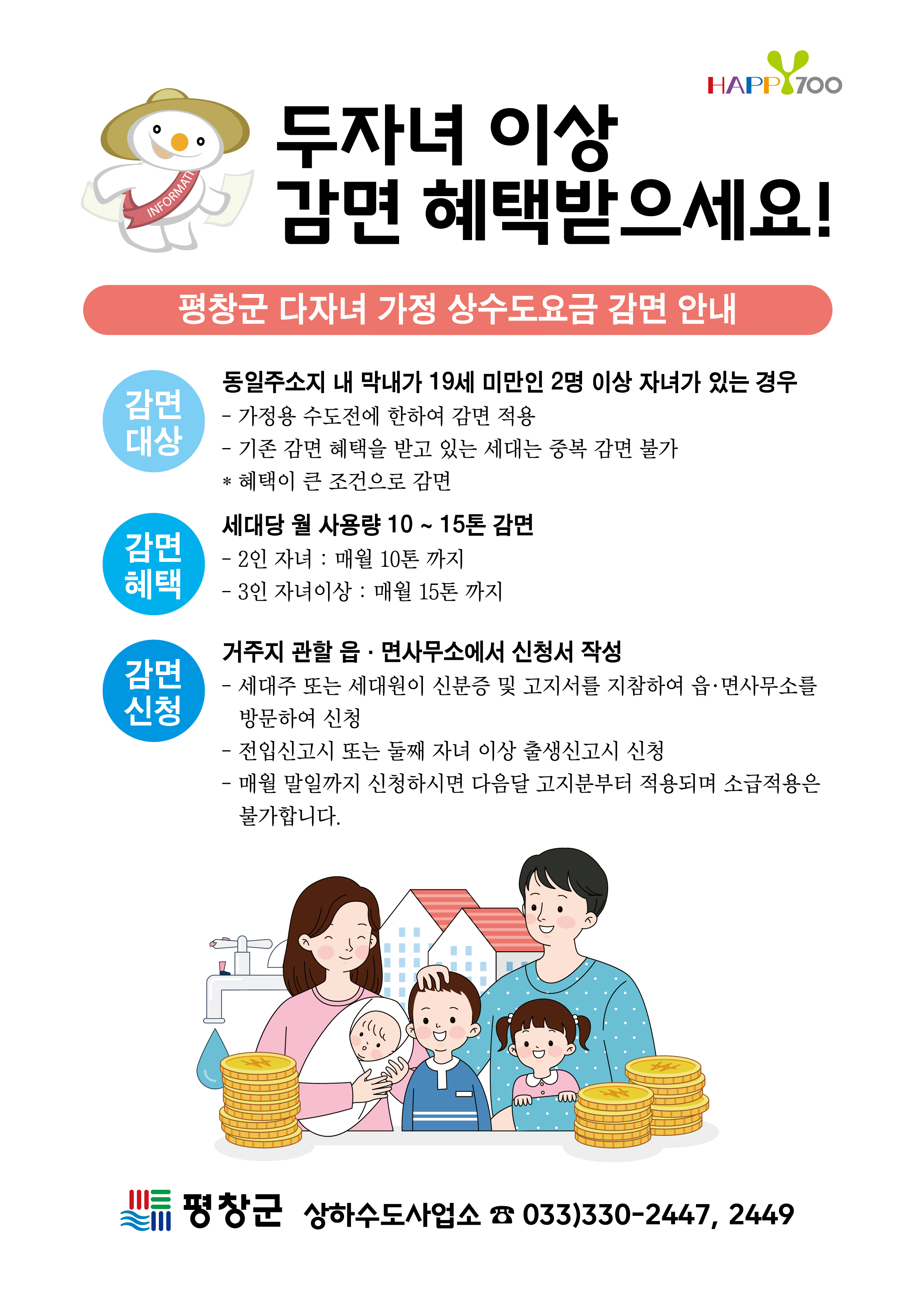 수도요금 다자녀 가정 감면혜택 안내(두 자녀부터)