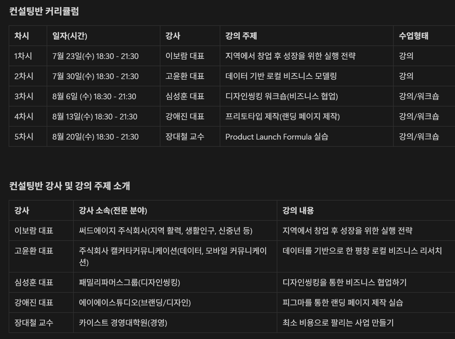 ※ 수강생 중 컨설팅을 희망하는 경우, 1팀당 2시간 이내 별도 컨설팅 제공