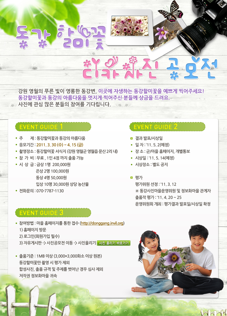 영월 동강愛래프팅 정보화마을에서 동강할미꽃을 주제로 “동강할미꽃 디카사진 공모전”을 아래와 같이 진행하오니 많은 사진 애호가들의 많은 참여바랍니다.