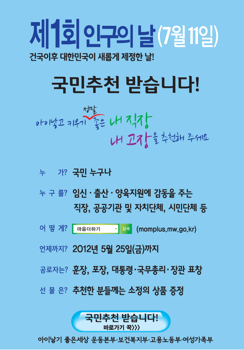 보건복지부에서는 7월 11일 제1회 인구의 날을 맞아 국민추천 포상을 접수합니다.