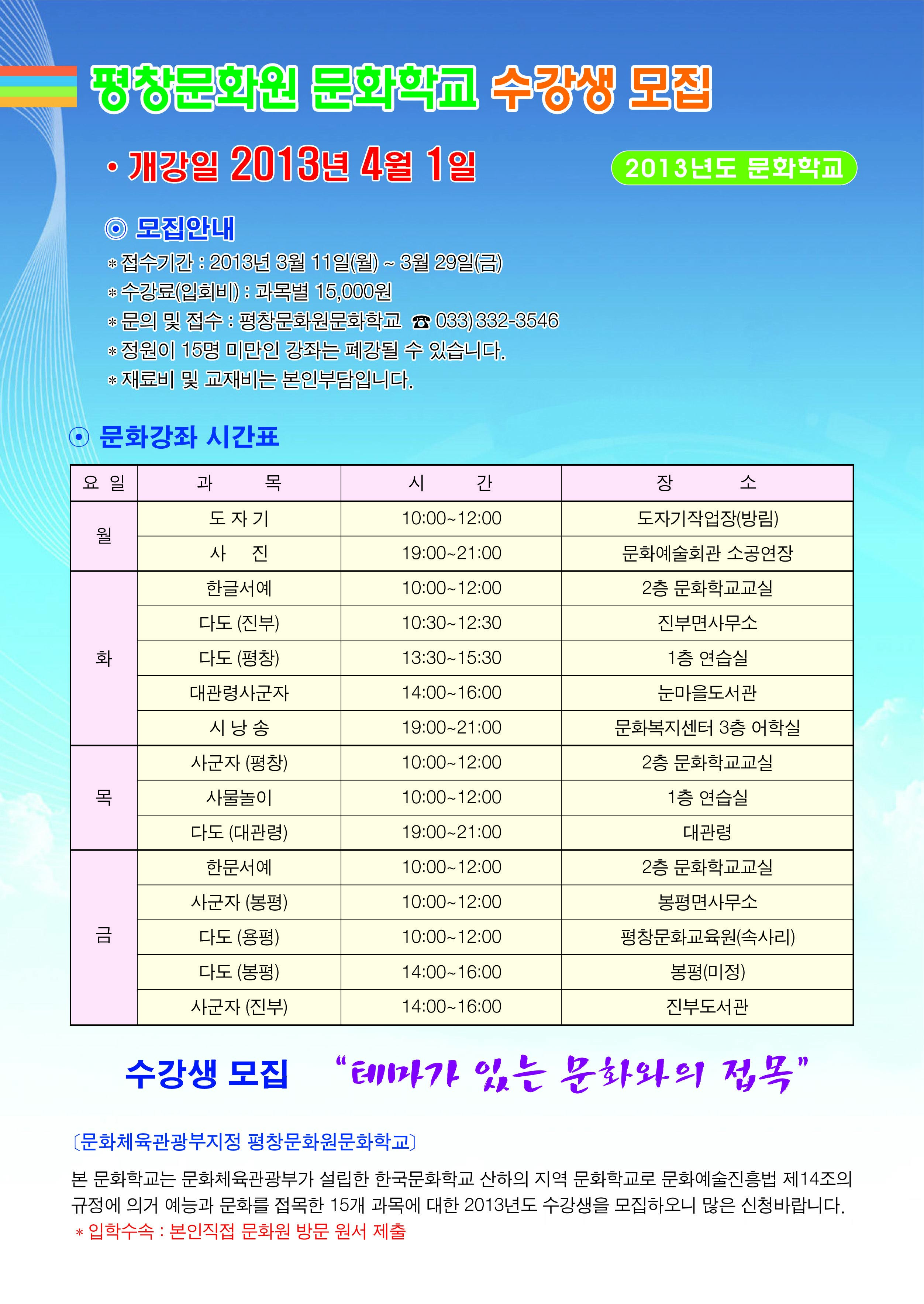 - 문의 및 접수 : 평창문화원문화학교 ☎033)332-3546