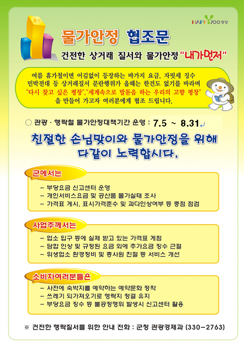 여름 휴가철이면 어김없이 등장하는 바가지 요금, 자릿세 징수, 민박전대 등 상거래질서 물란행위가 올해는 한건도 없기를 바라며 "다시 찾고 싶은 평창", "세계속으로 발돋음 하는 우리의 고향 평창"을 만들어 가고자 붙임과 같이 여러분에게 협조 드립니다.