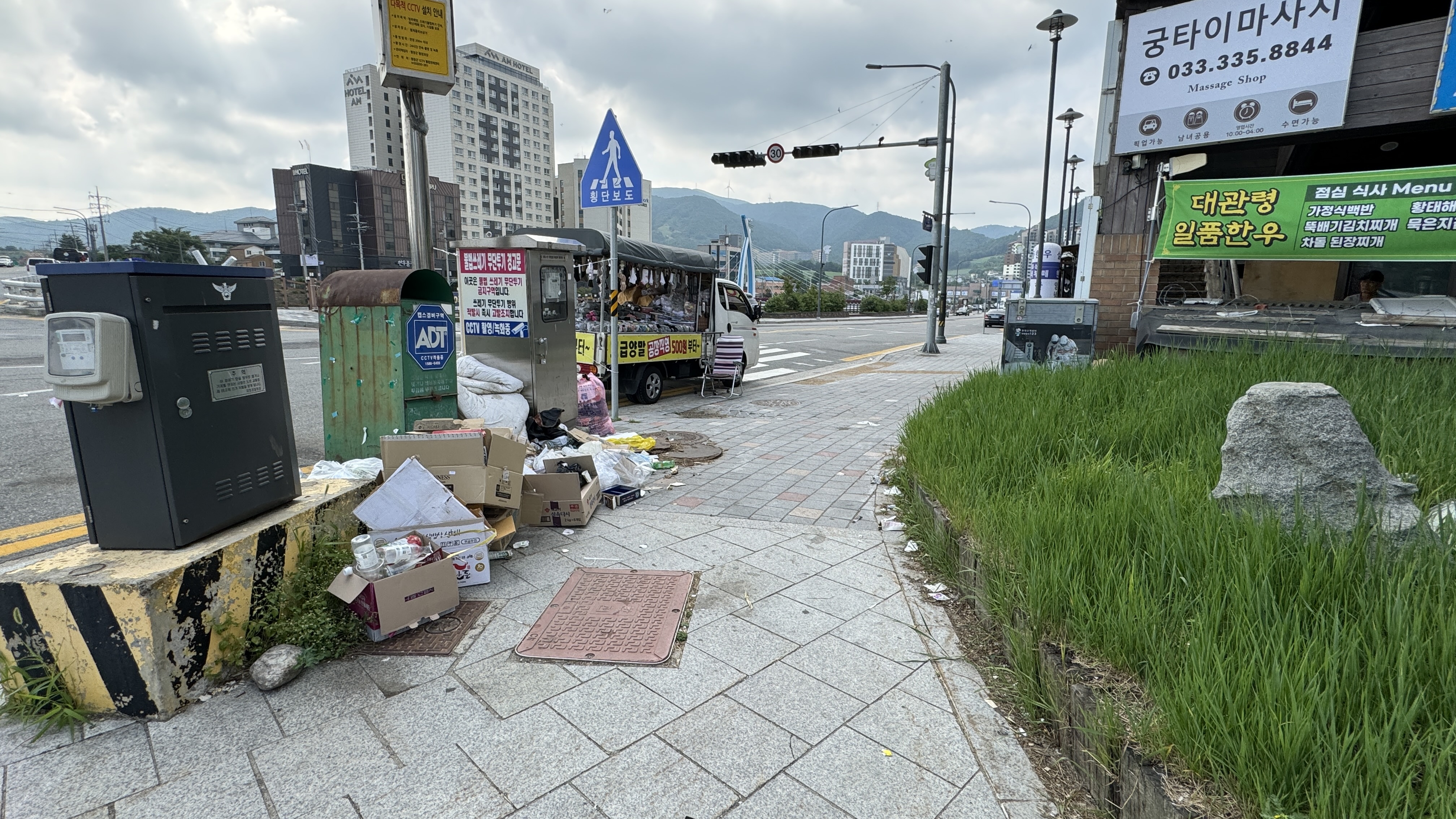 대관령로와 눈마을길 교차로 인도에 쓰레기가 방치되어 있습니다. 면사무소에서 신경써 주시기 바랍니다.
