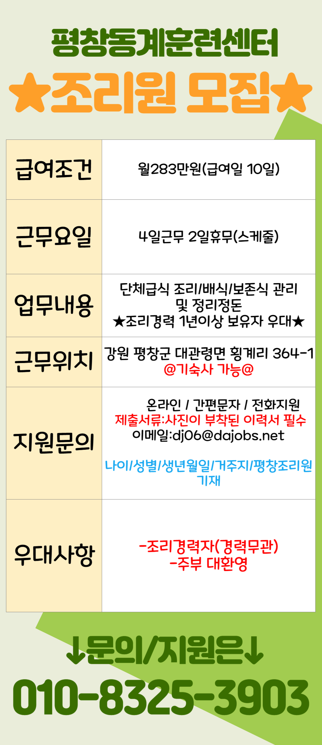 -근무위치 : 강원도 평창군 대관령면 횡계리 364-1 평창동계훈련센터(기숙사 가능합니다)