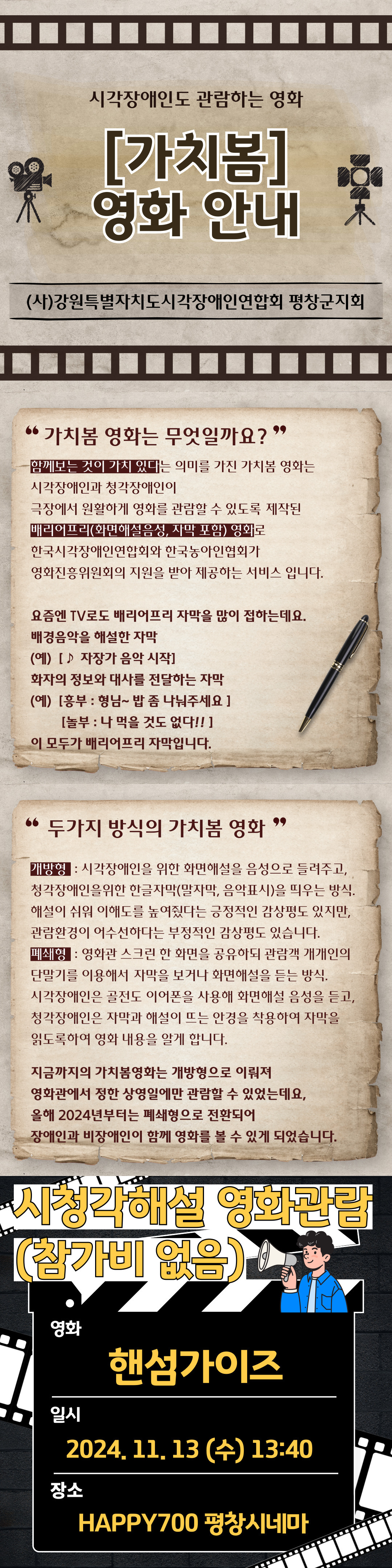 (사)강원특별자치도시각장애인연합회 평창군지회에서 시각장애인의 영화관람 방법에 대해 알려드립니다.
