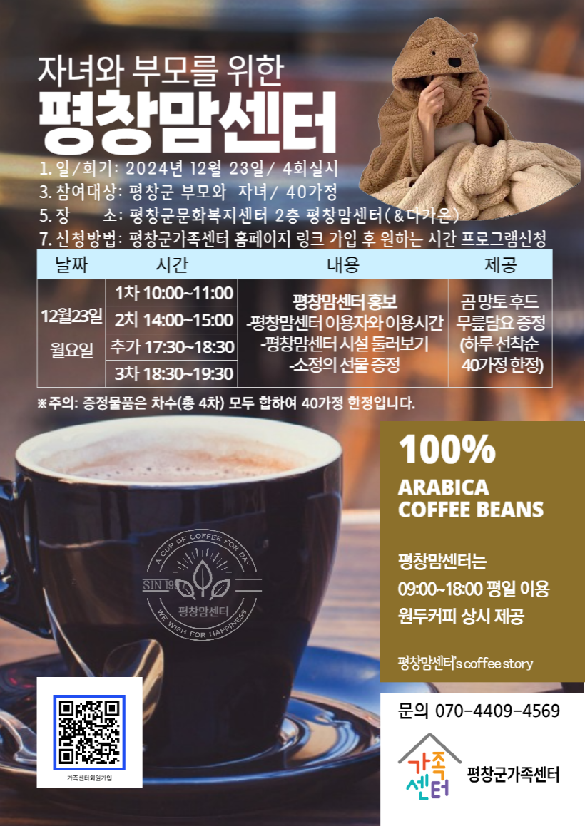 접수방법: 홈페이지 가입후 프로그램 신청(https://pyeongchang.familynet.or.kr/center/index.do)