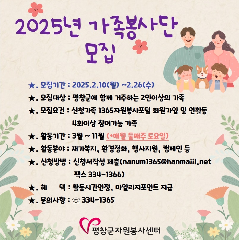 2025년 평창군가족봉사단 모집을 2.26(수)일까지 모집합니다.