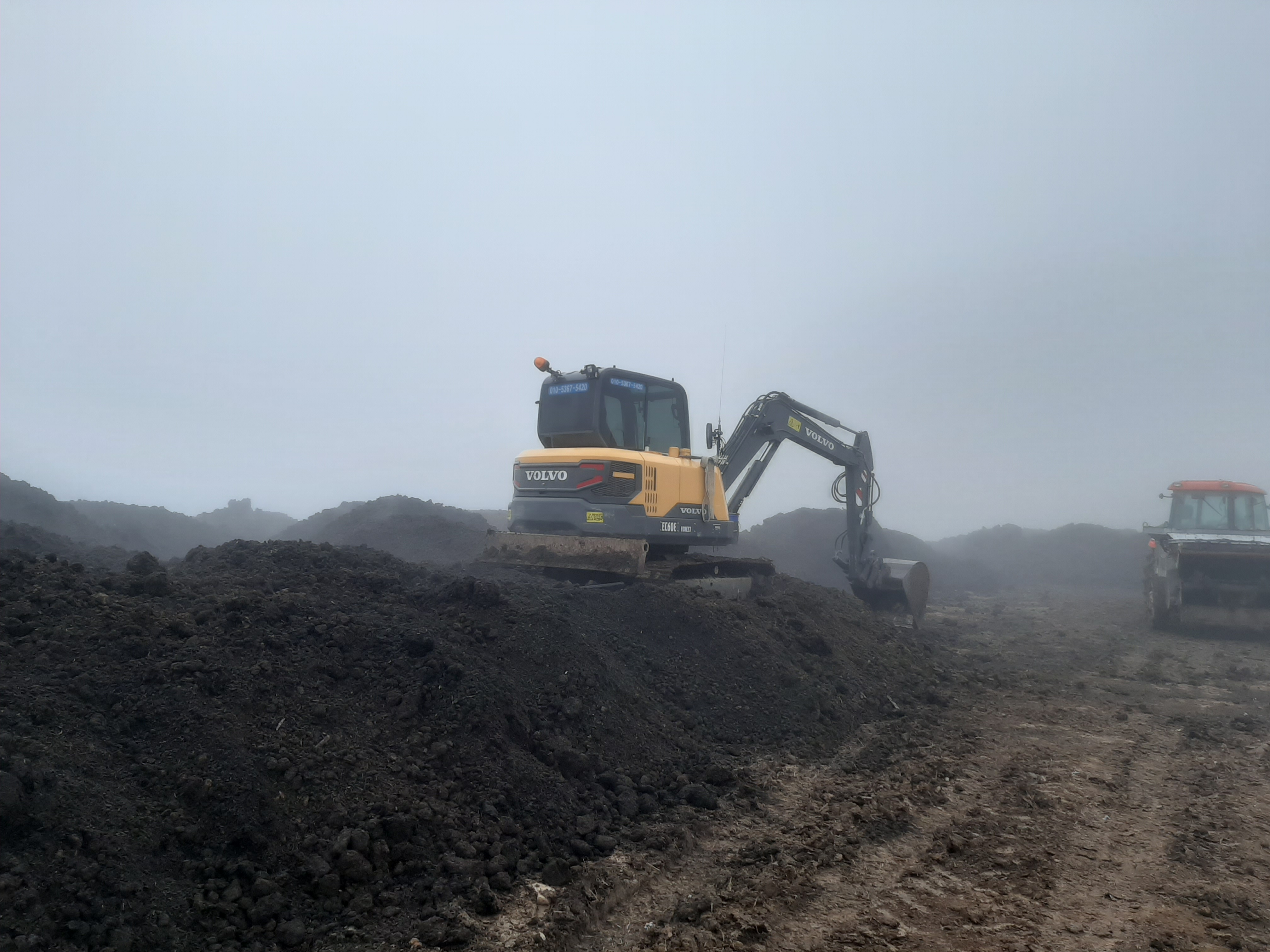벌써 수천톤을 쌓아놓고, 불도져 2대 포크레인 3대 운반차 2대 트랙터 3대를 동원하여 굉음을 내며 폐기물을 펴고 있다.
