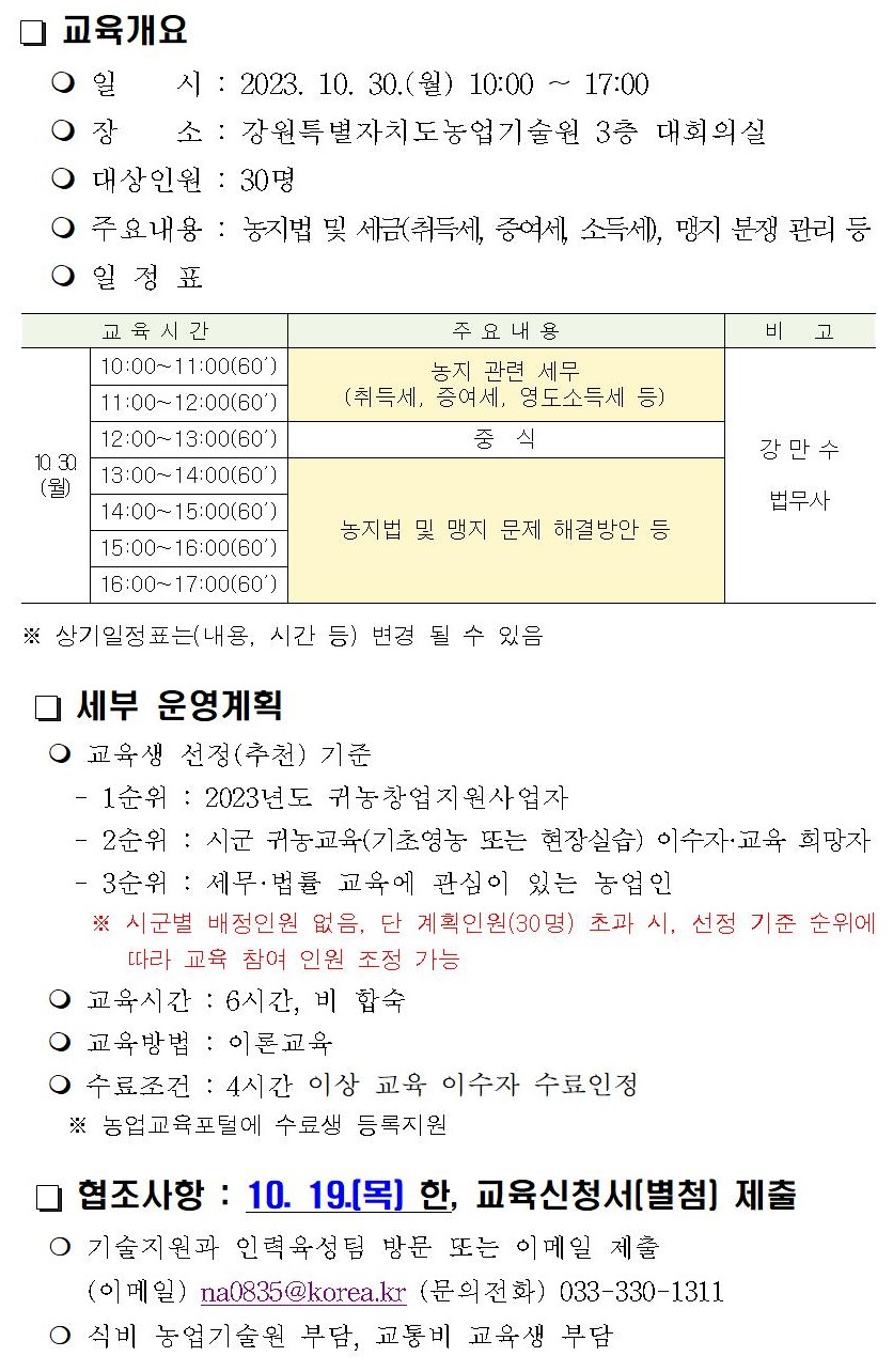 2023년 귀농귀촌인 영농생활 세무·법률 교육계획을 아래와 같이 안내드리오니,