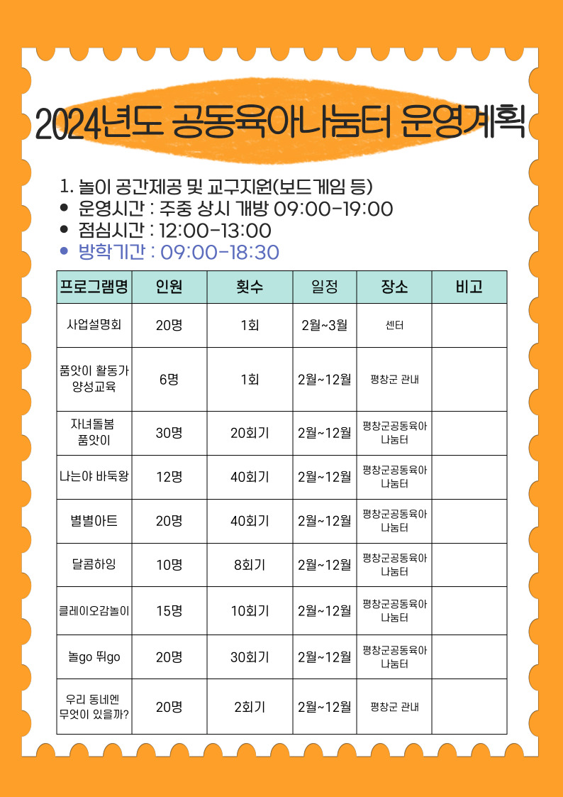 2024년 평창군공동육아나눔터 이용모집입니다. ^^