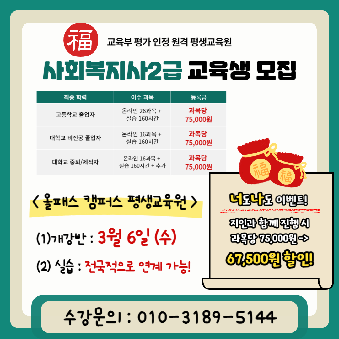 [공고] 사회복지2급, 무시험 50% 교육생 모집