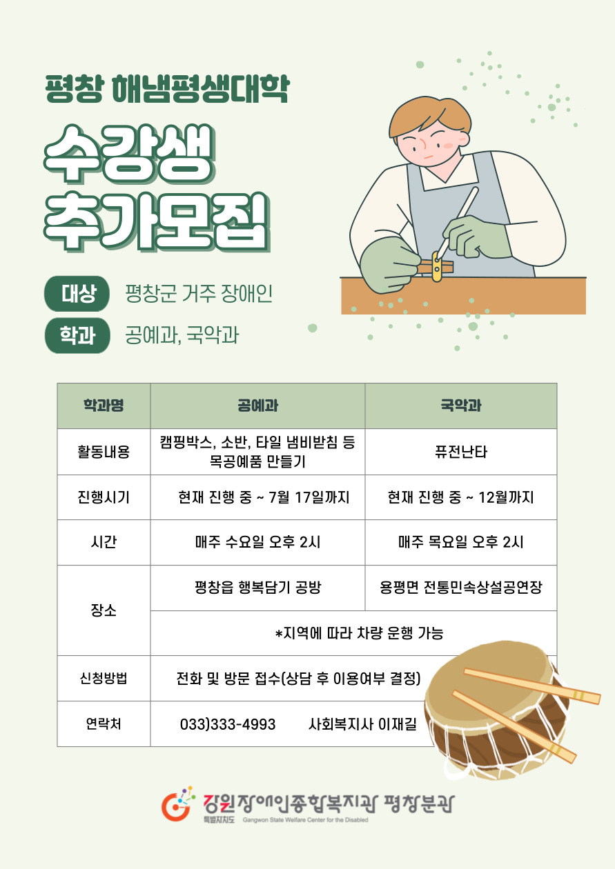 장애인 평생학습 '해냄평생대학' 수강생을 추가 모집합니다.