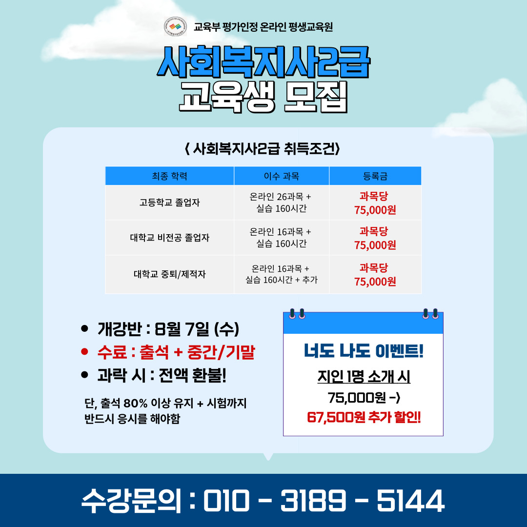 [공고] 사회복지2급, 무시험과정 1년 교육생 모집