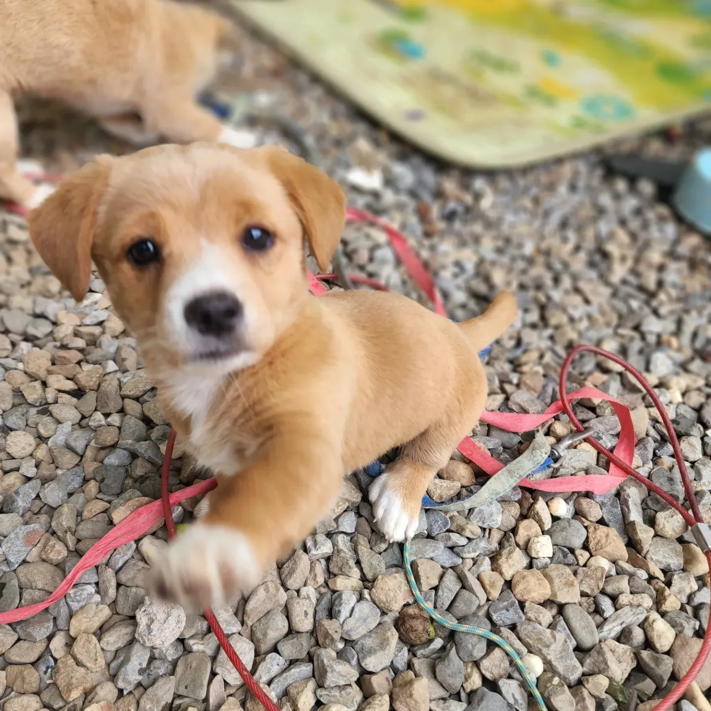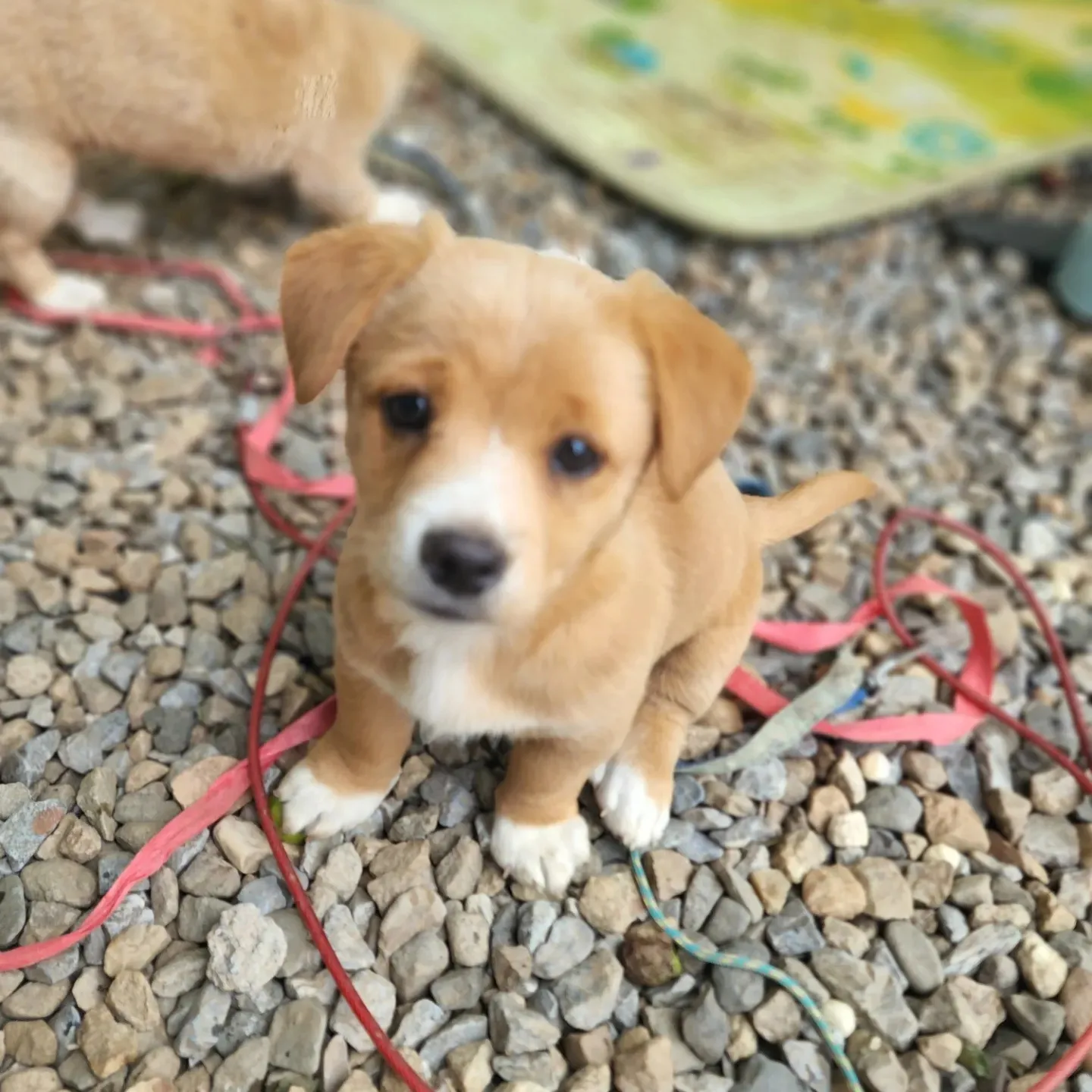 울타리안에 있던 새끼강아지가 작은 틈 사이로 나와 밖으로 나간 것 같습니다.