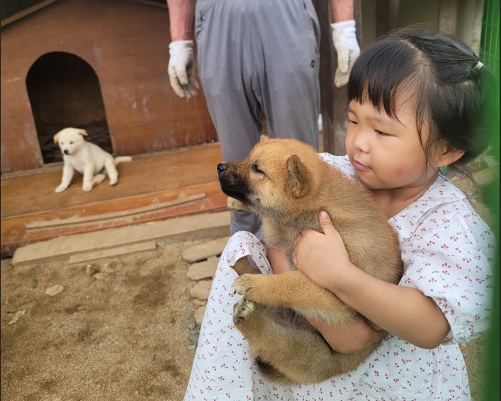 2. 이번이 두 번째 출산이며, 백구 2 / 황구 3마리이며 황구 한마리만 암컷입니다.