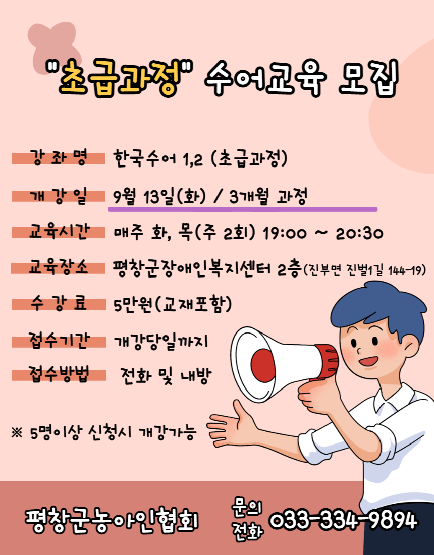 4. 교육장소: 평창군장애인복지센터 2층(진부면 진벌1길 144-19)5. 수 강 료: 5만원(교재비 포함)