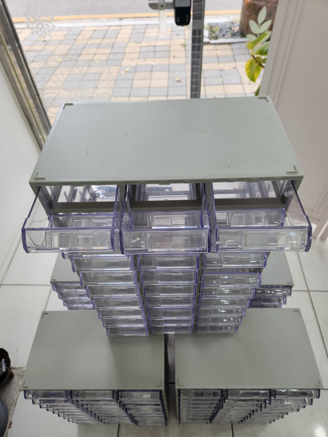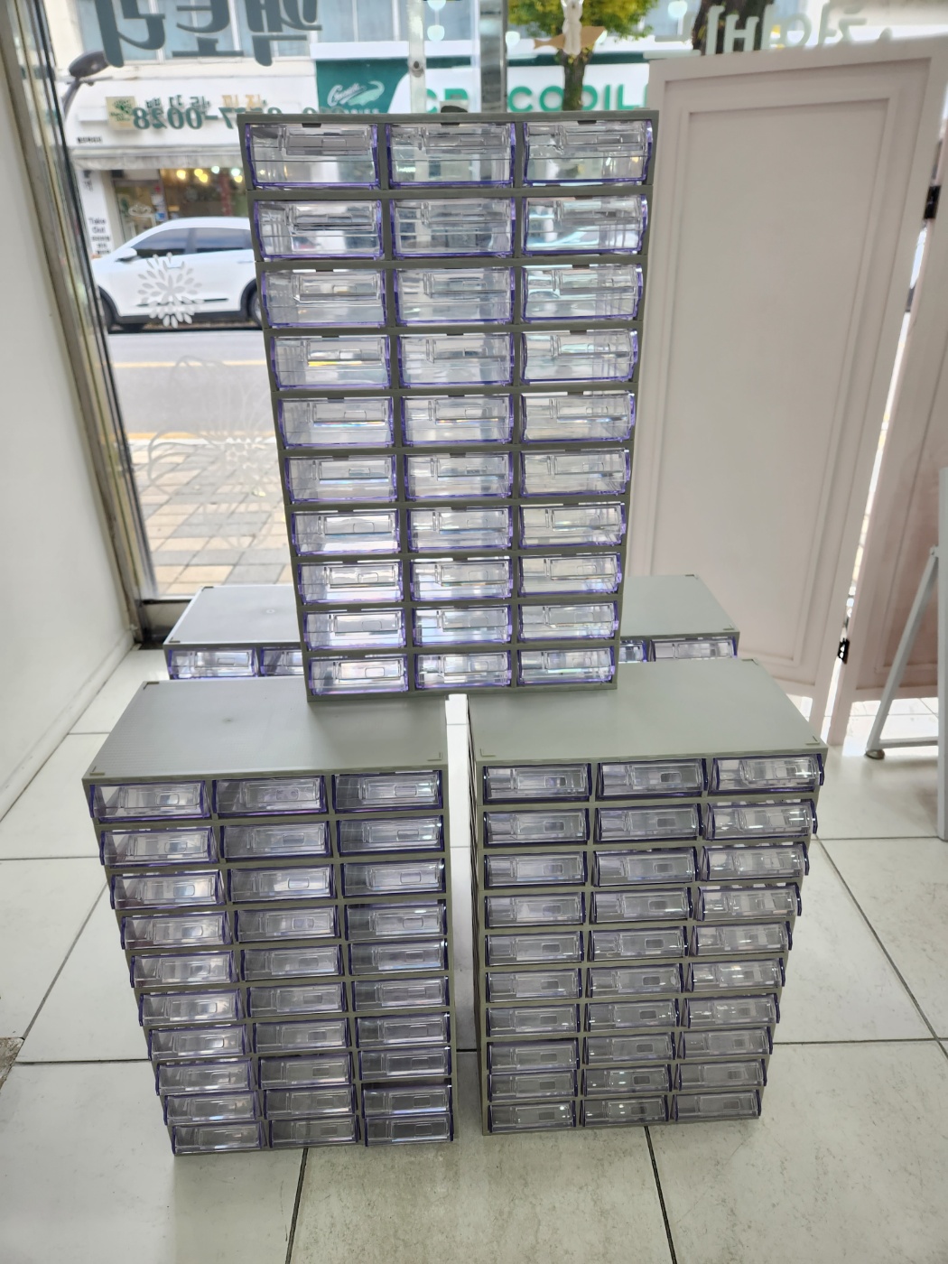 총 5개 구성이고 서랍 사이즈 한개당 가로 10, 길이 18 정도입니다.