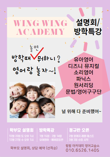프리미엄 영어, 윙윙 아카데미가 겨울방학 특강을 시작으로 오픈합니다.