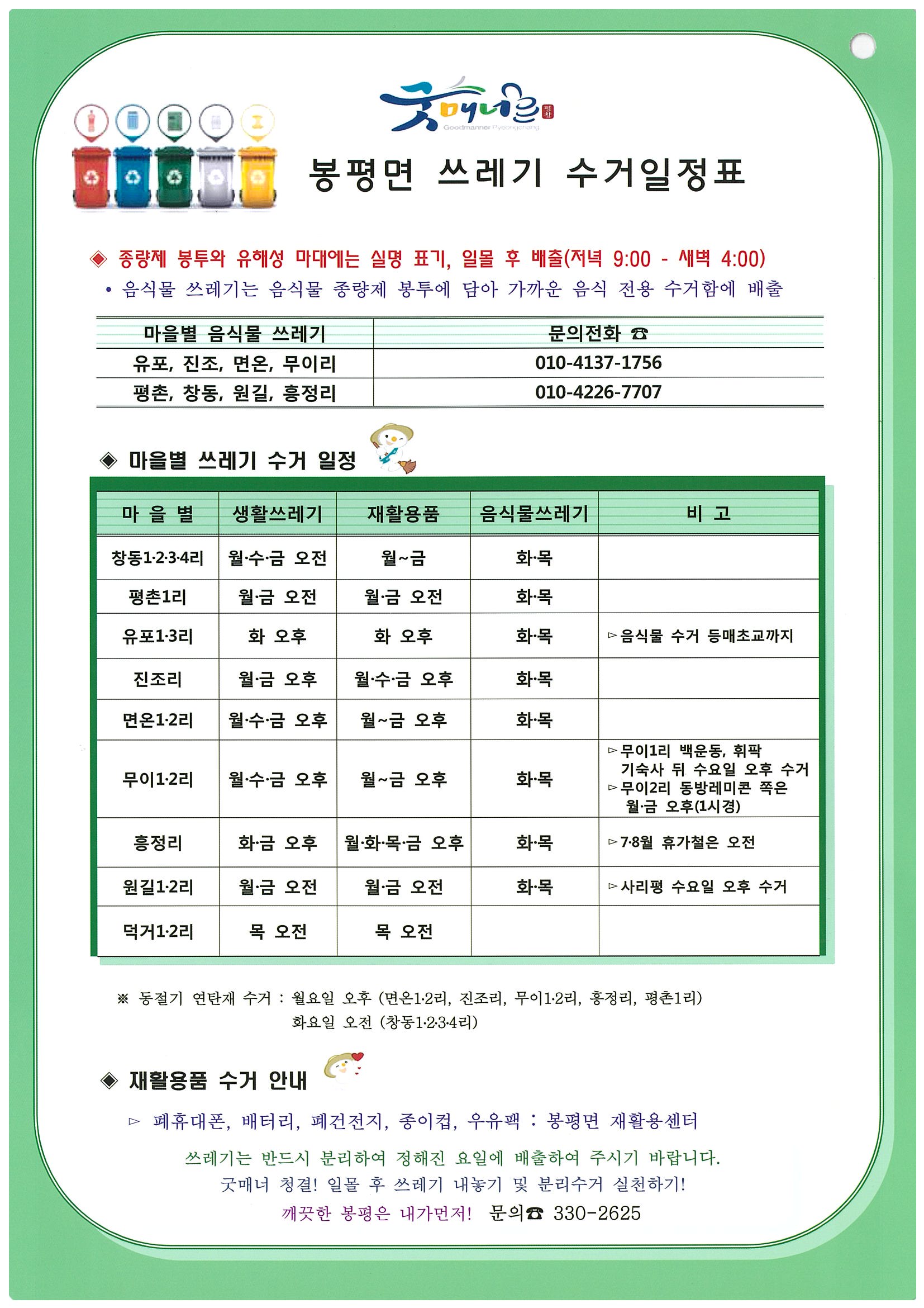 봉평면 쓰레기수거일정 및 배출방법 안내