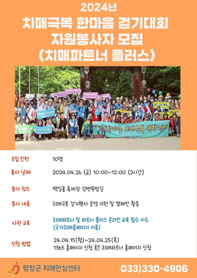2024년 치매안심센터 치매극복 한마음 걷기대회 자원봉사자를 모집합니다!