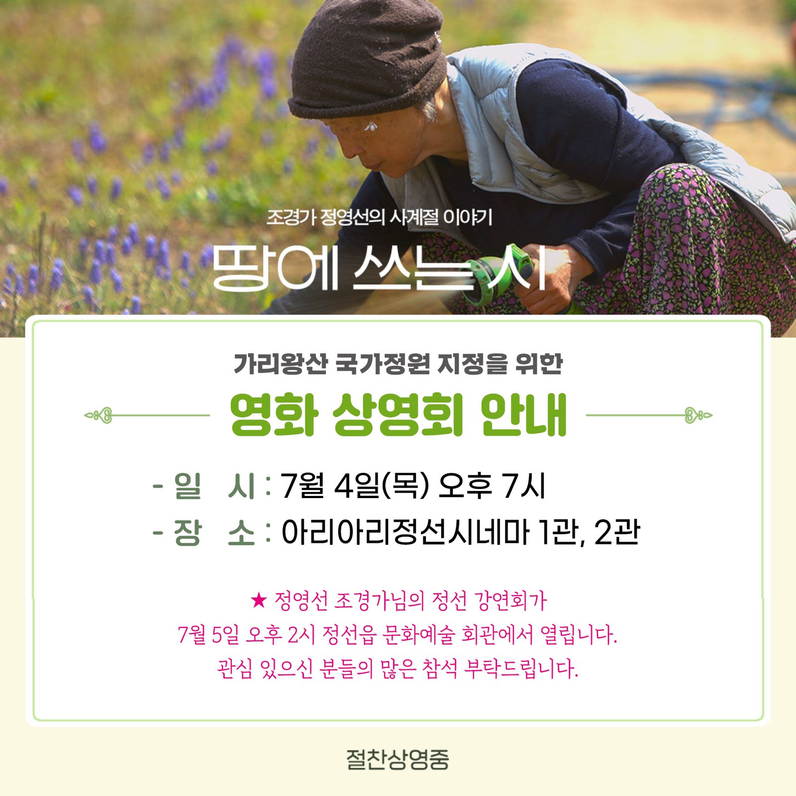 ‘땅에 쓰는 시’ 상영회가 7월2일 저녁 고한 시네마,